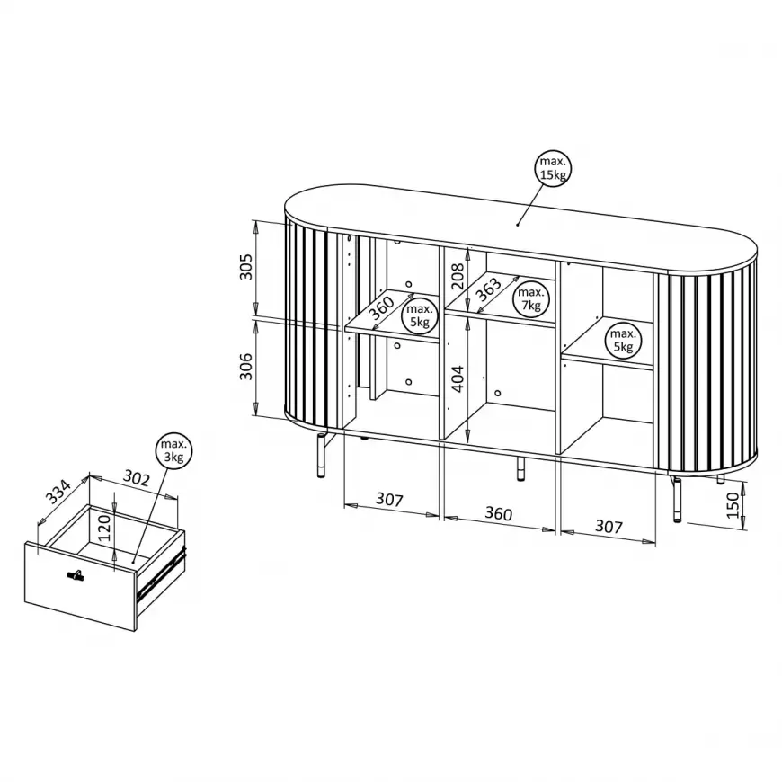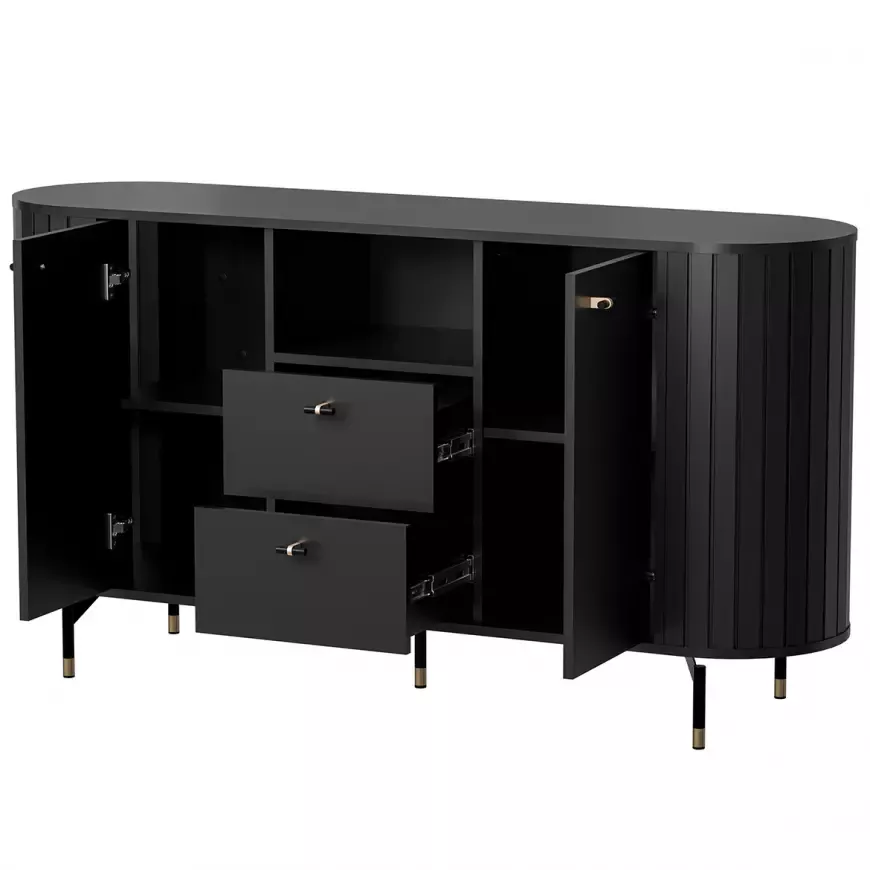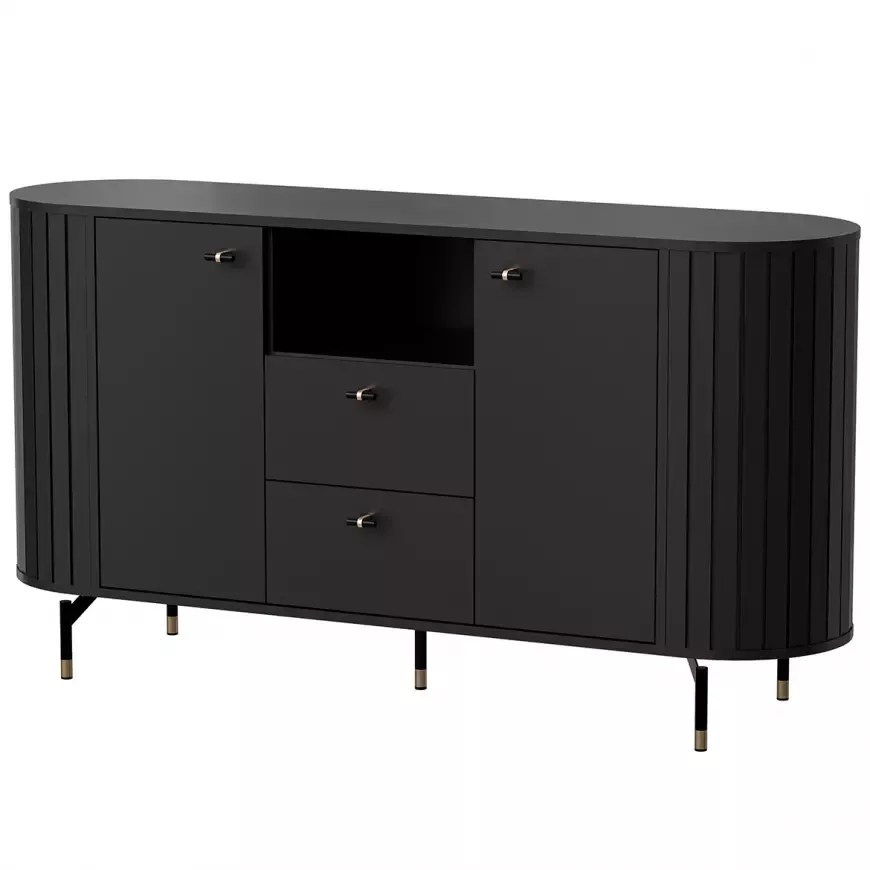 Kombinovaná komoda APEX spojuje luxusní vzhled s praktičností. Kombinace skříněk, šuplíků a otevřené police nabízí místo na dokumenty, suvenýry i dekorace. Zdobení v podobě lamel zaujme na první pohled a přidává nábytku jedinečný styl.