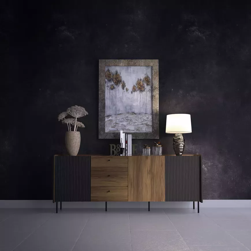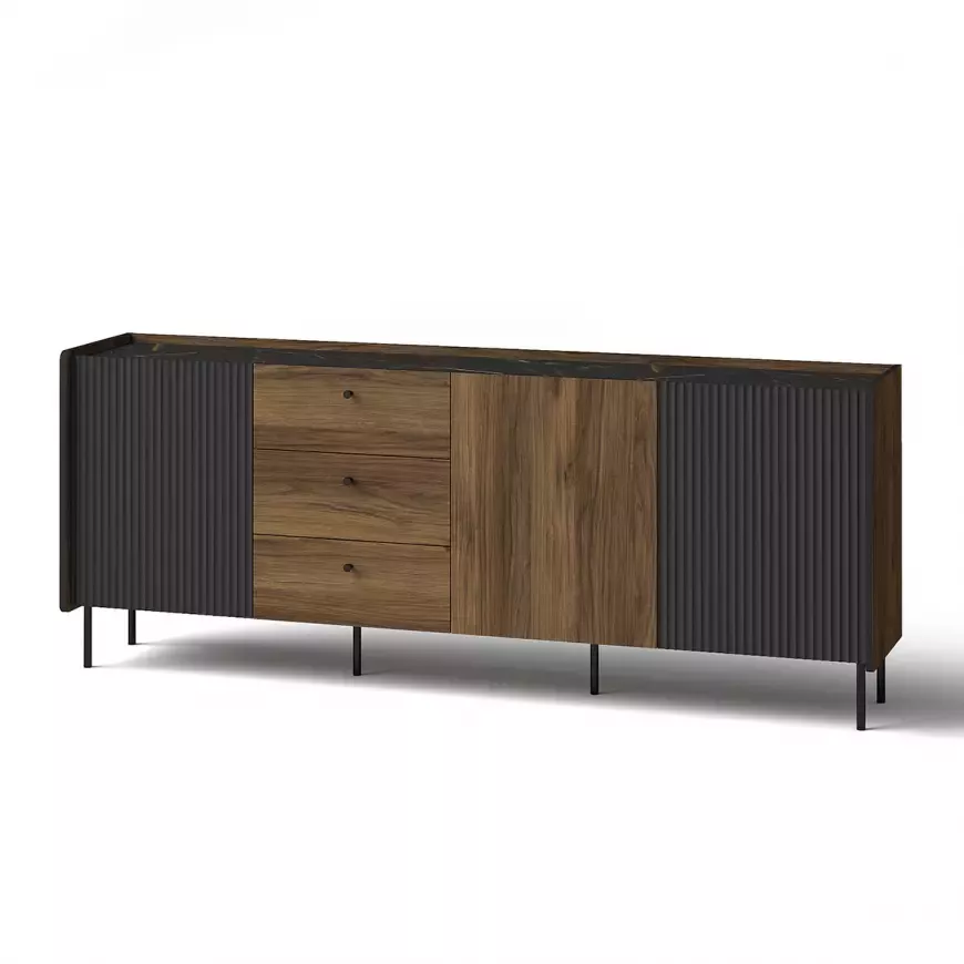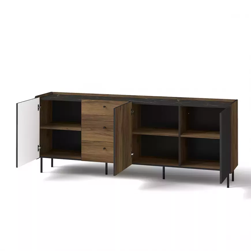 Kombinovaná široká komoda ASHEBORO je charakteristická svými drážkovanými čely dvířek a horní deskou s dekorem mramoru. Komoda nabízí dostatek úložného prostoru pro uložení dokumentů, dekorací a suvenýrů. Stabilitu zajišťují vysoké kovové nožky.