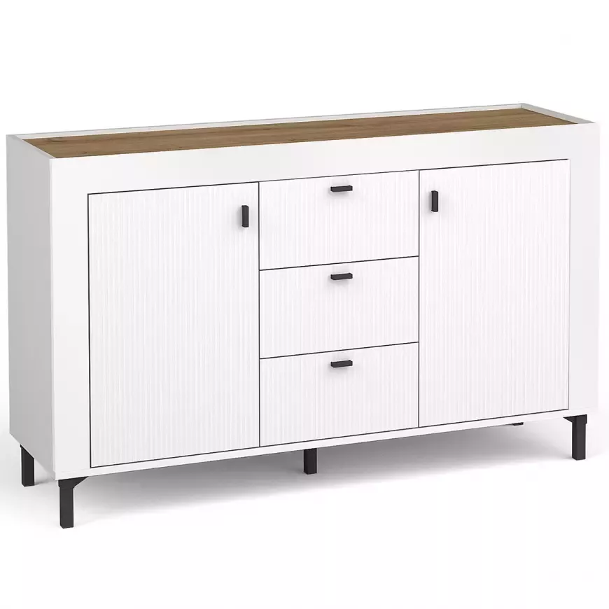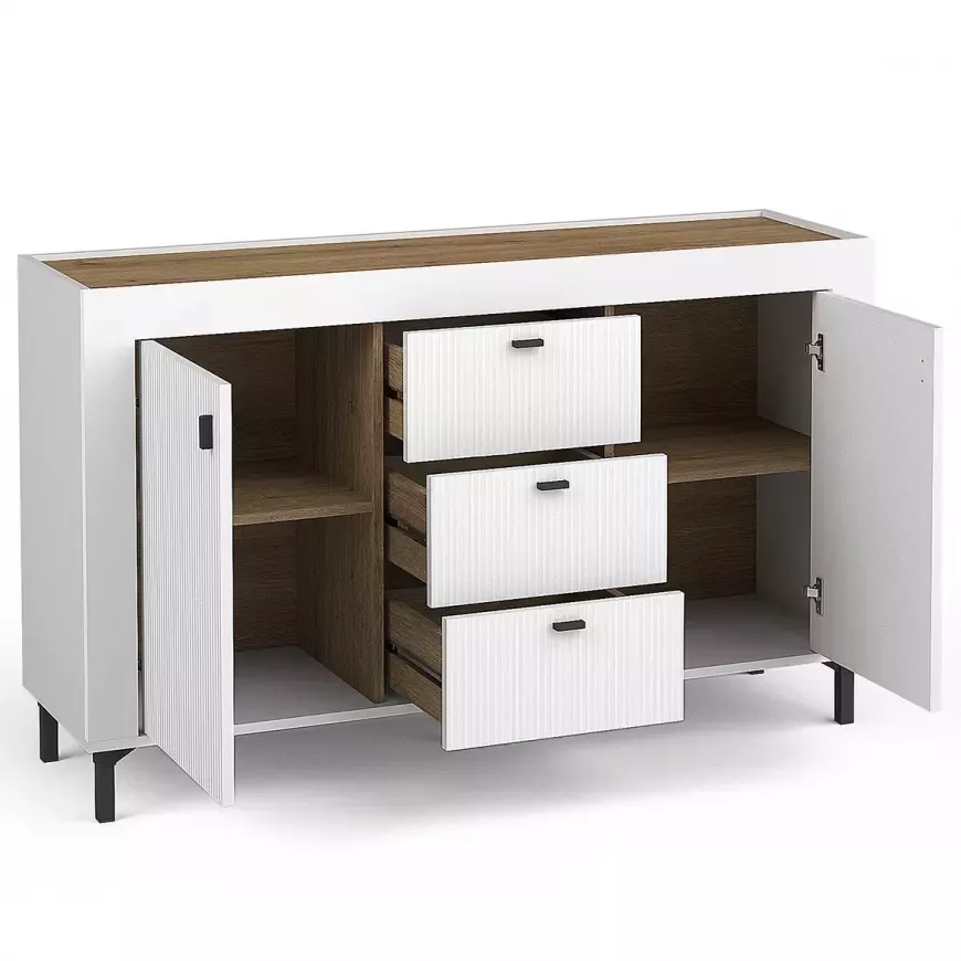 Kombinovaná komoda AUROVA spojuje praktičnost s vytříbeným stylem. Uzavřené skříňky a šuplíky nabídnou prostor pro dekorace a vše, co má zůstat schované. Drážkovaná čela přidávají jemný a elegantní akcent, který zaujme na první pohled.