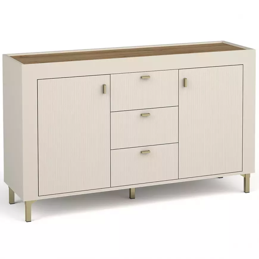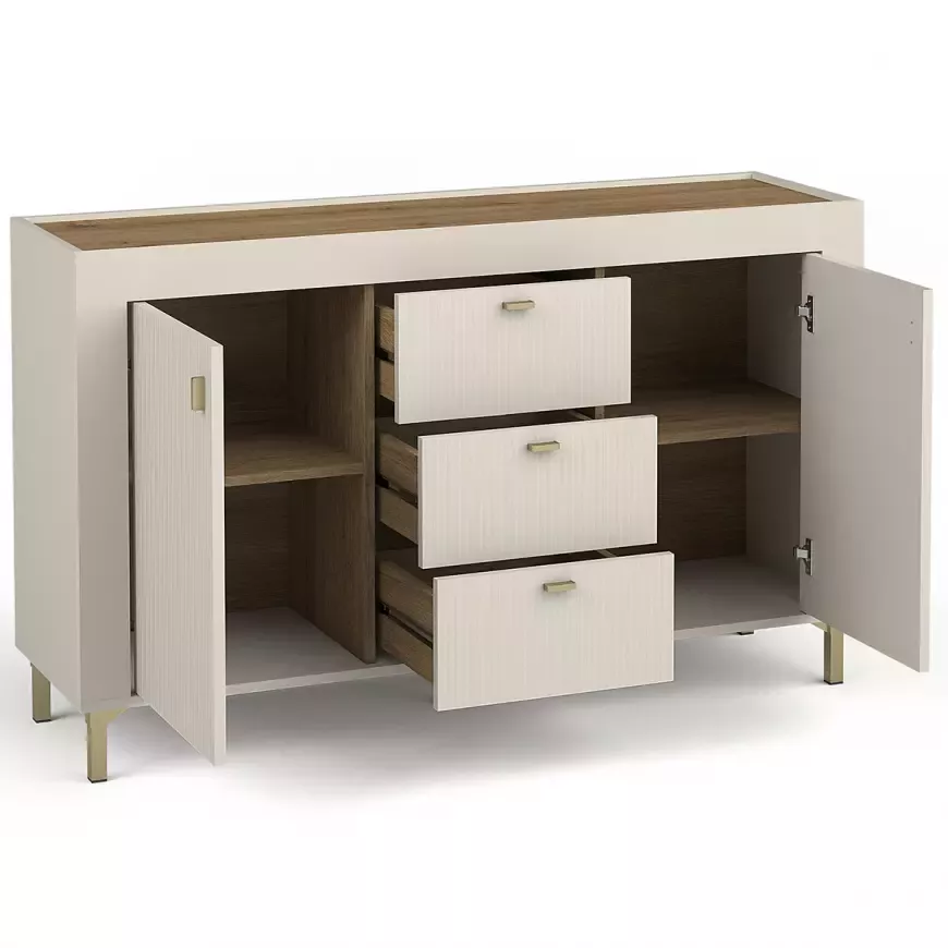 Kombinovaná komoda AUROVA spojuje praktičnost s vytříbeným stylem. Uzavřené skříňky a šuplíky nabídnou prostor pro dekorace a vše, co má zůstat schované. Drážkovaná čela přidávají jemný a elegantní akcent, který zaujme na první pohled.