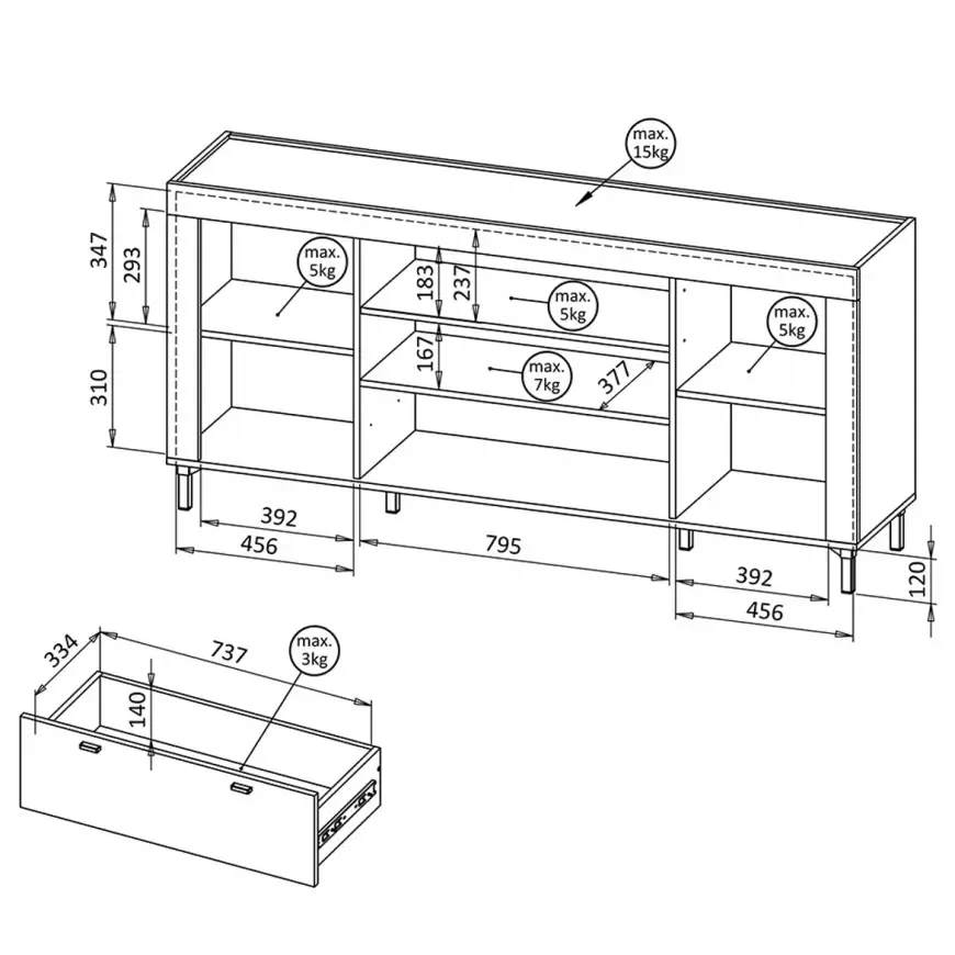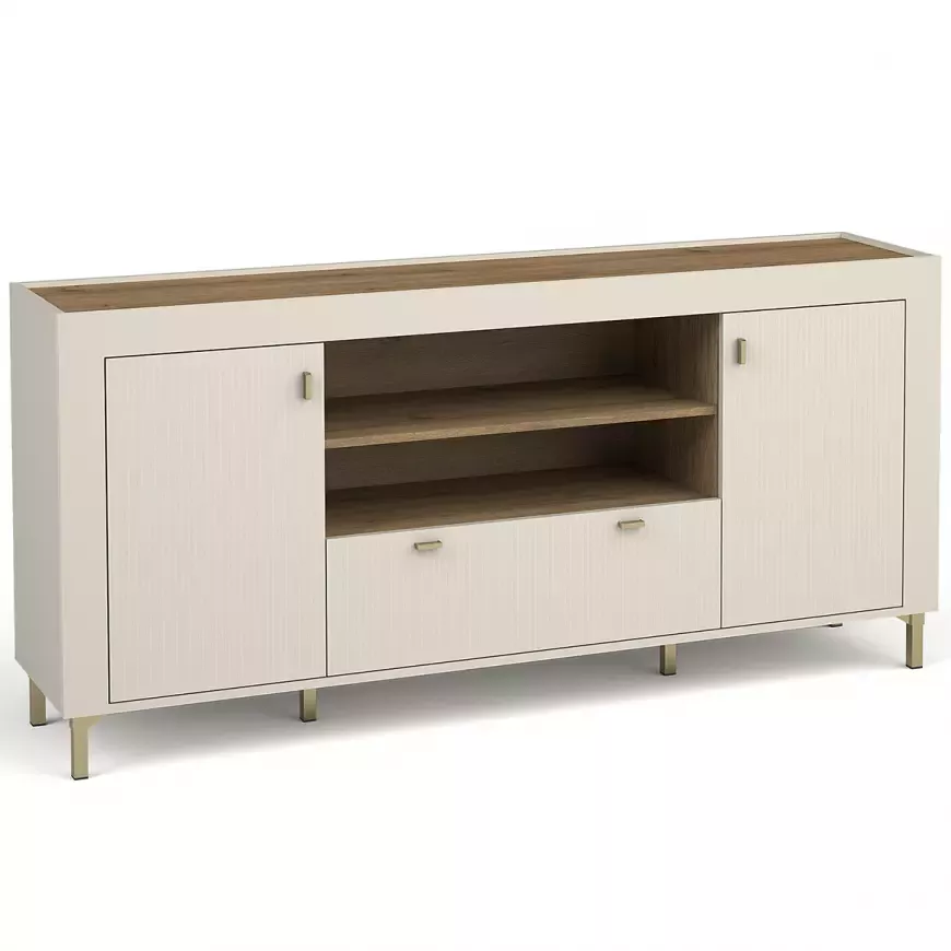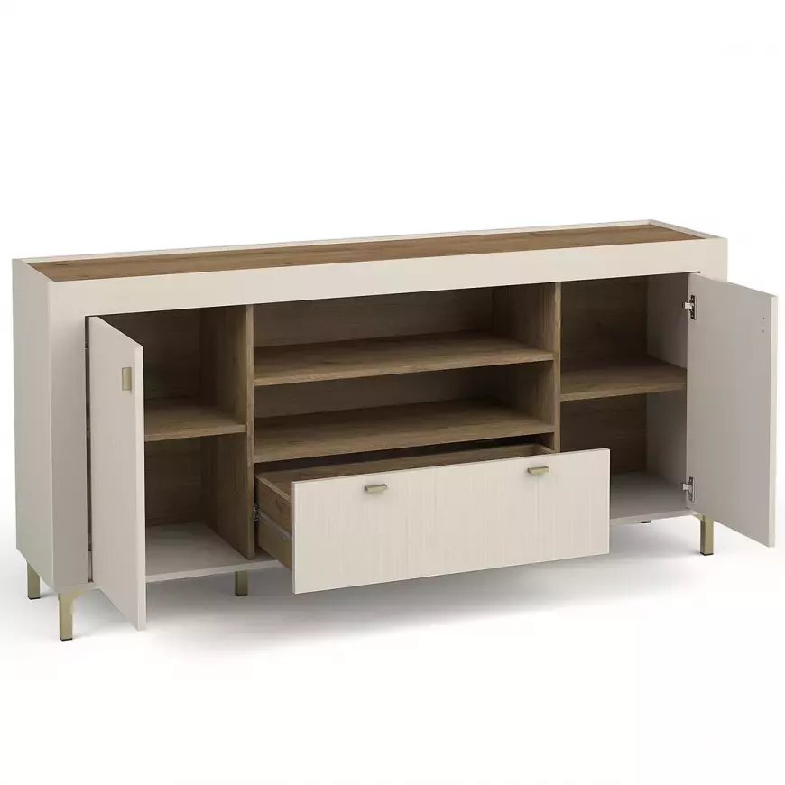 Široká kombinovaná komoda AUROVA spojuje praktičnost s vytříbeným stylem. Uzavřené skříňky a šuplíky nabídnou prostor pro dekorace a vše, co má zůstat schované. Drážkovaná čela přidávají jemný a elegantní akcent, který zaujme na první pohled.