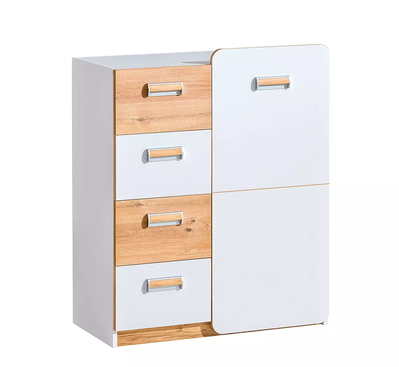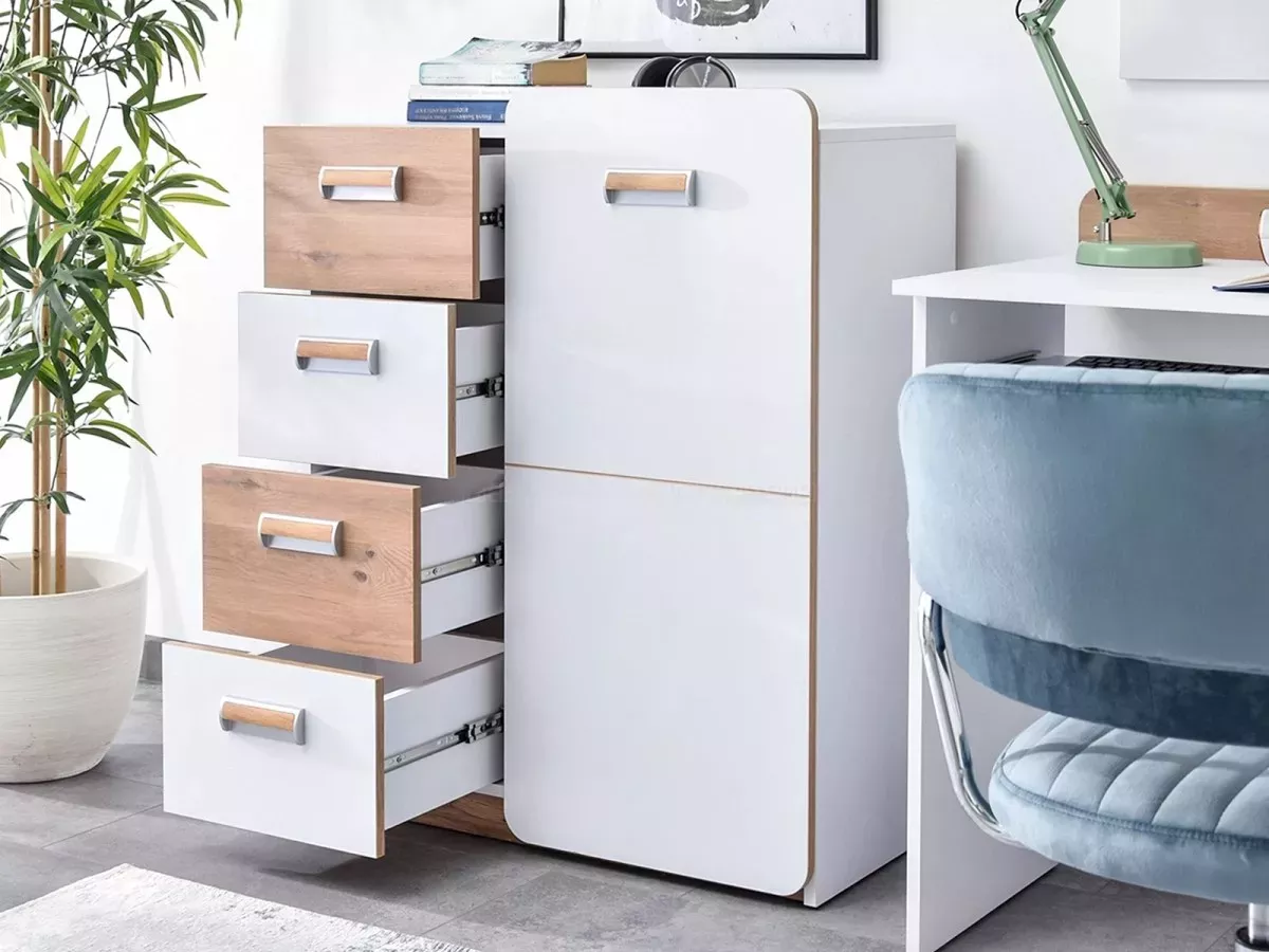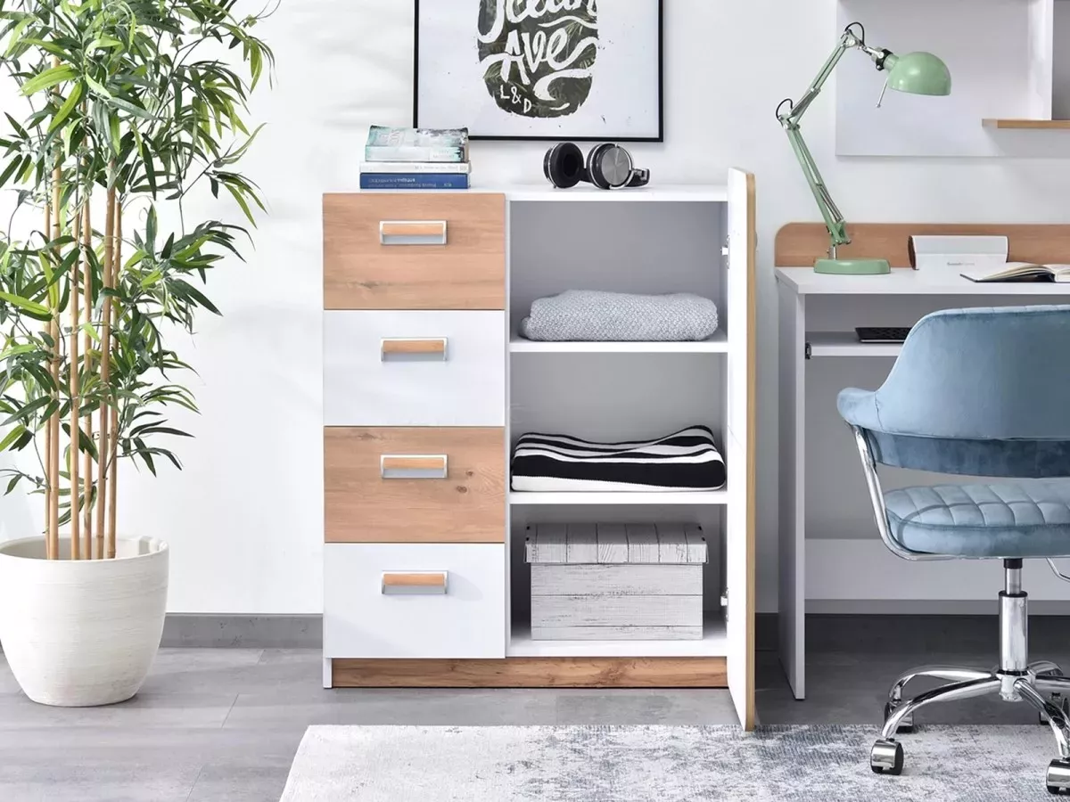 Kombinovaná komoda CEDAR je velmi praktickým kusem nábytku, který najde uplatnění v mnoha stylech interiéru. Nabízí 4 šuplíky a 1 uzavřenou skříňku s 2 policemi. Navíc je komoda vybavená systémem tichého zavírání, což zpříjemní každodenní používání.