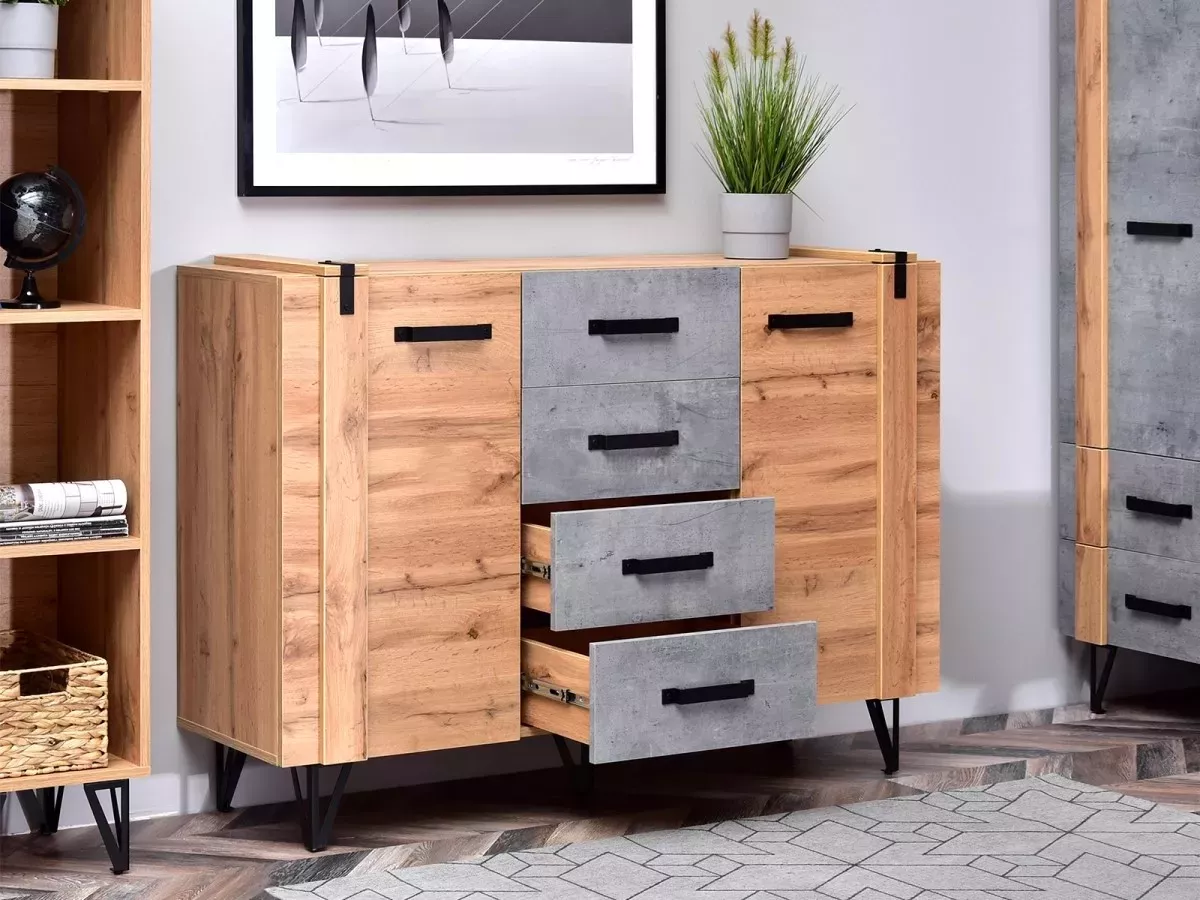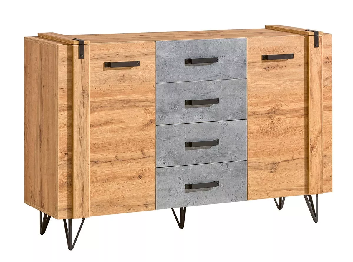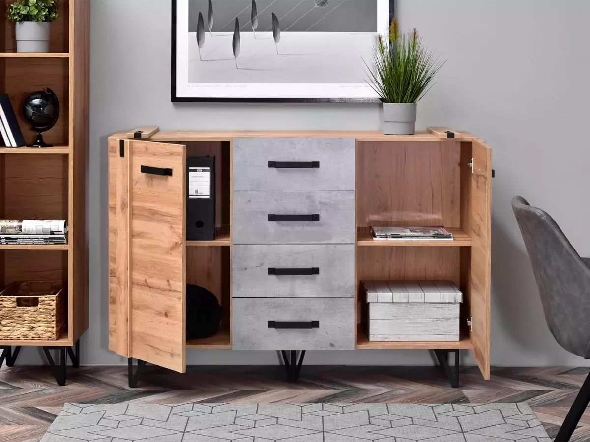Kombinovaná komoda CONOVER nabídne dostatek prostoru k uložení veškerých dokumentů nebo vystavení dekorací a suvenýrů. Nadčasová kombinace dubového dekoru s betonovými akcenty a kovovou základnou dokonale zapadne do každého loftového interiéru.