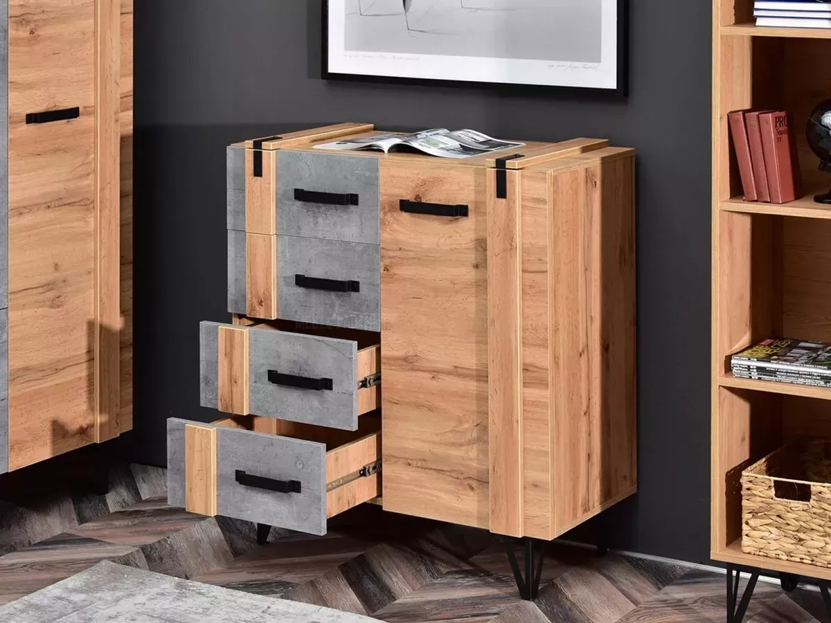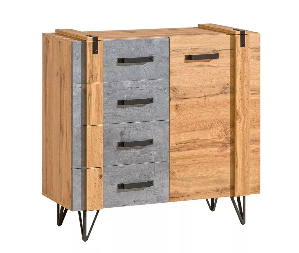 Kombinovaná úzká komoda CONOVER - dub wotan / beton / černá