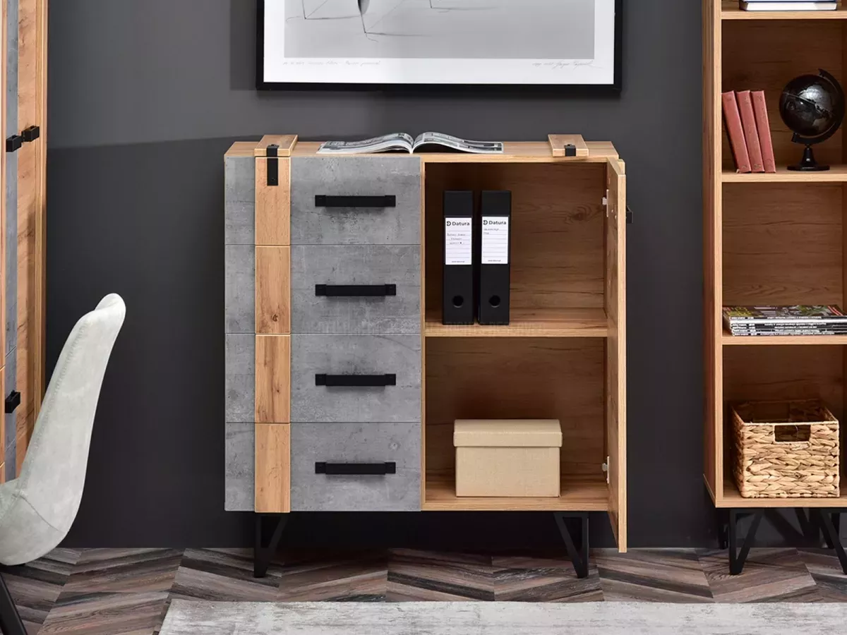Kombinovaná úzká komoda CONOVER nabídne dostatek prostoru k uložení veškerých dokumentů nebo vystavení dekorací a suvenýrů. Nadčasová kombinace dubového dekoru s betonovými akcenty a kovovou základnou dokonale zapadne do každého loftového interiéru.