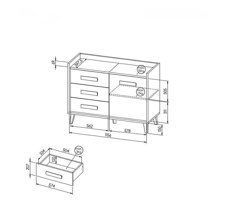 Kombinovaná komoda DOBSON je postavená na pevných nohou, které komodě zajišťují stabilitu. Disponuje 3 šuplíky a uzavřenou skříňkou s policí. Komoda skvěle zapadne do každého studentského nebo dětského pokoje.