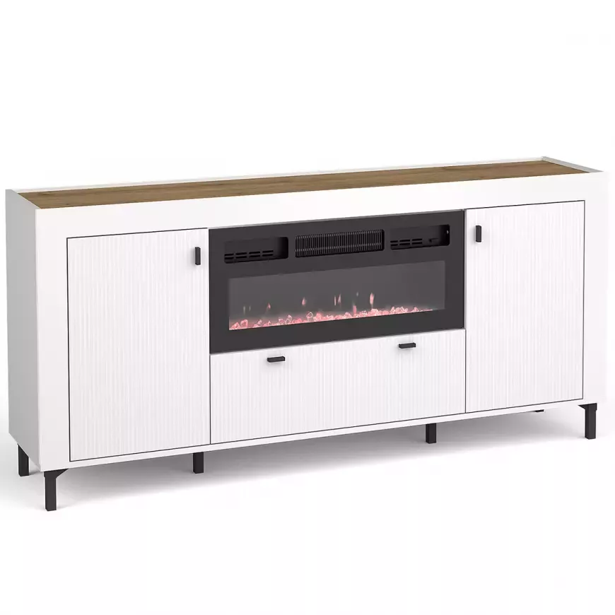 Široká komoda s elektrickým krbem AUROVA - bílá / dub whiskey