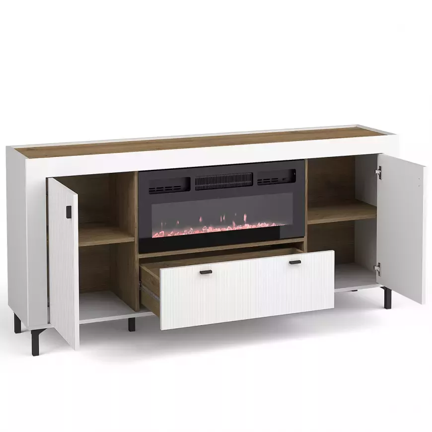 Široká komoda s elektrickým krbem AUROVA spojuje praktičnost s vytříbeným stylem. Uzavřené skříňky a otevřené police nabídnou prostor pro dekorace a vše, co má zůstat schované. Drážkovaná čela přidávají jemný a elegantní akcent, který zaujme na první pohled. Součástí komody je elektrický krb, který vytvoří ve vašem obývacím pokoji útulnou atmosféru.