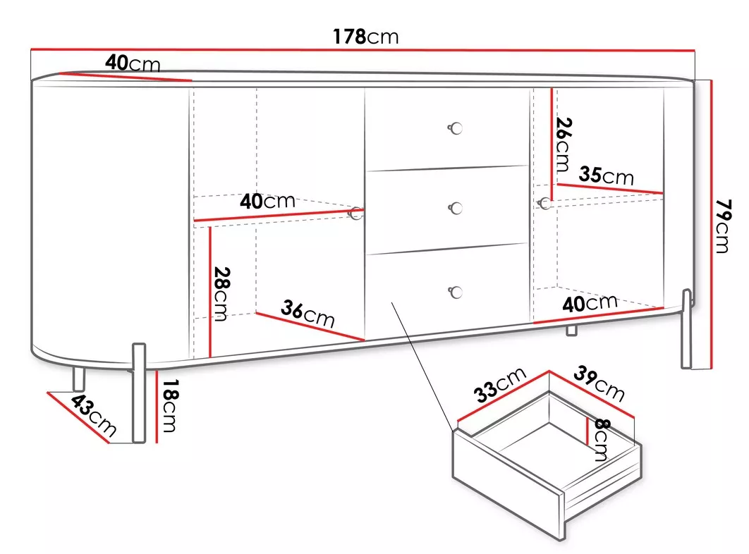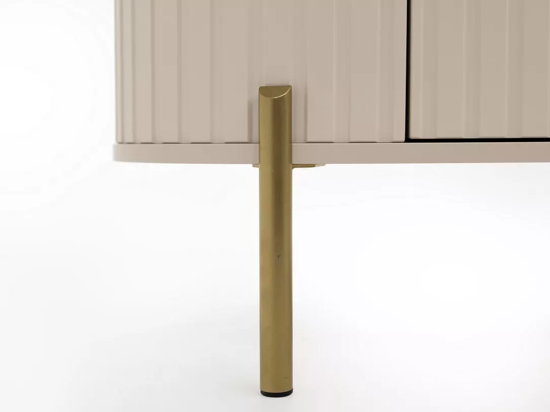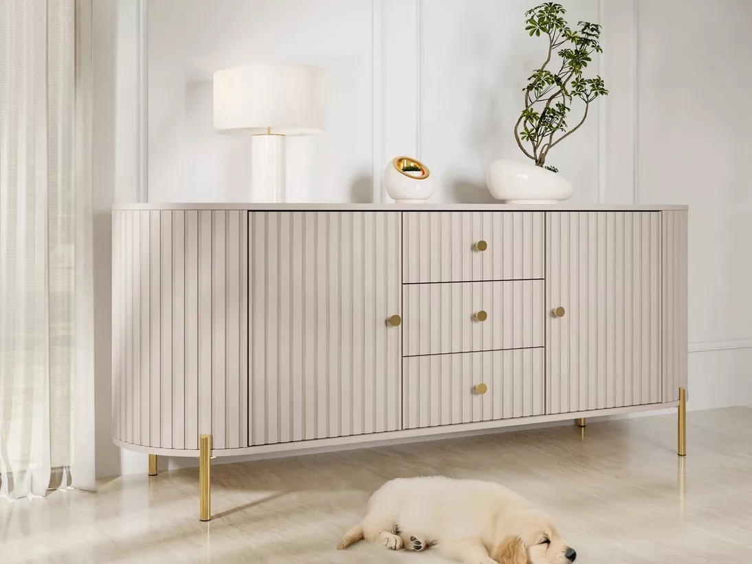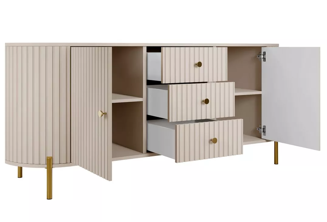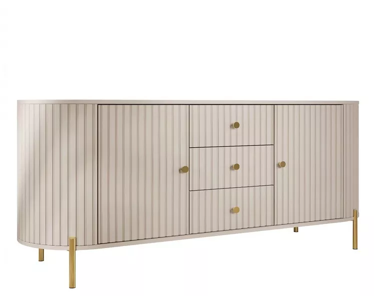 Kombinovaná komoda TAZEVEL spojuje funkčnost s elegantním designem a promyšleným úložným prostorem. 3 centrální zásuvky a 2 boční skříňky poskytují dostatek místa pro všechny potřeby, zatímco vyvýšený design usnadňuje úklid. Jemně zaoblené boky a svislé drážky na předních dílech dodávají komodě jedinečný vzhled a opticky zeštíhlují její tvar.