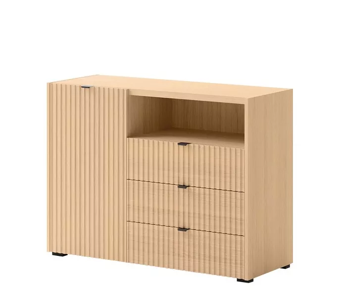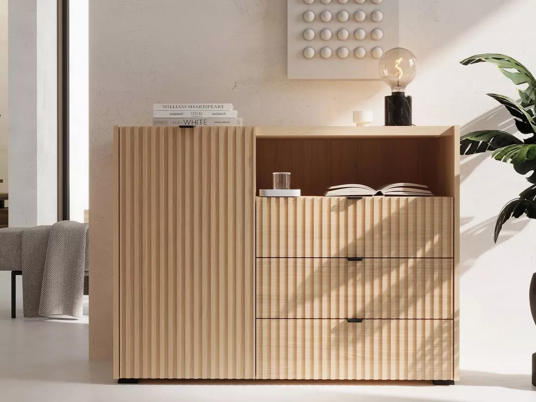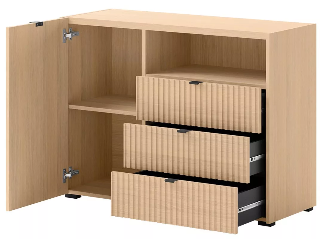 Komoda s dvířky a šuplíky TROUTDALE přináší do interiéru styl a praktický úložný prostor. Minimalistický design s frézovanými předními díly dodává komodě charakter a zajímavý vizuální efekt. Prostorná skříňka, zásuvky a otevřená police nabízejí místo pro dekorace, doplňky i každodenní potřeby.