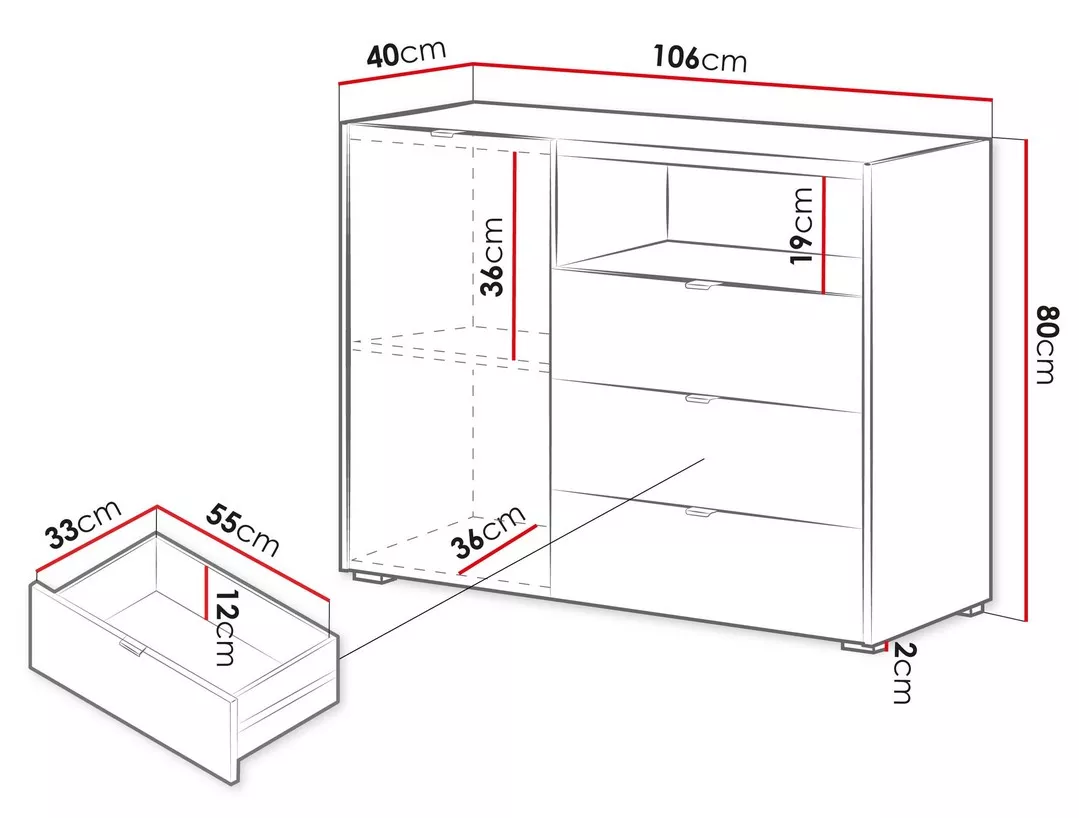 - čelo zásuvky: MDF o síle 18 mm potažená PVC fólií