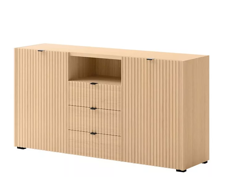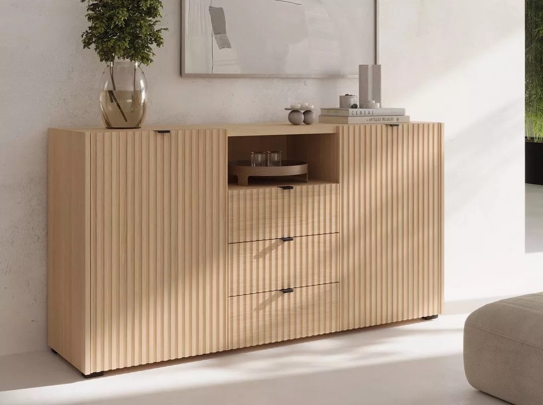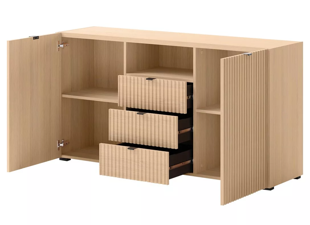 Široká komoda TROUTDALE s dvířky a šuplíky přináší do interiéru styl a praktický úložný prostor. Minimalistický design s frézovanými předními díly dodává komodě charakter a zajímavý vizuální efekt. Prostorné skříňky, zásuvky a otevřená police nabízejí místo pro dekorace, doplňky i každodenní potřeby.