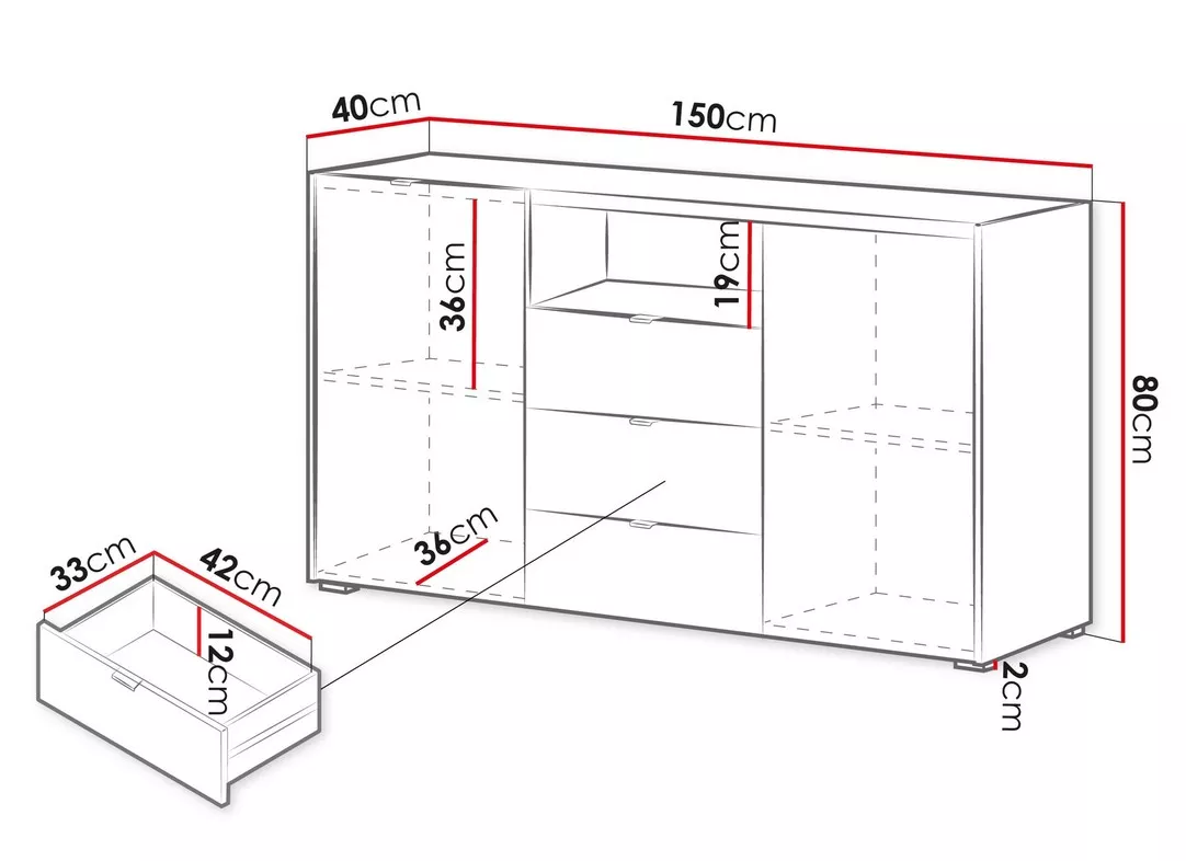 - čelo zásuvky: MDF o síle 18 mm potažená PVC fólií