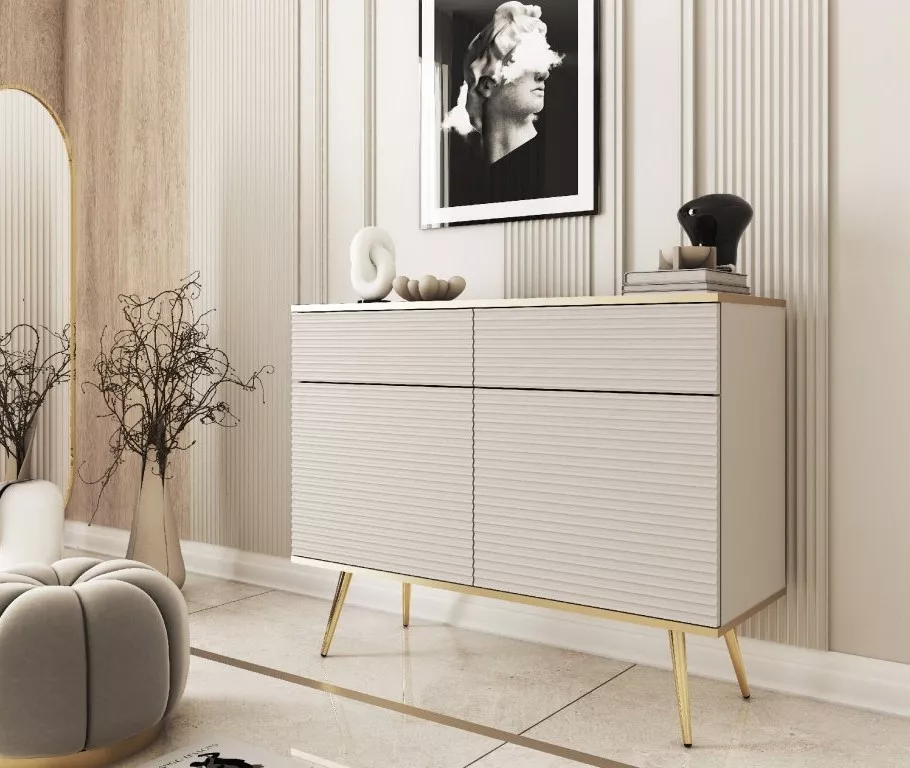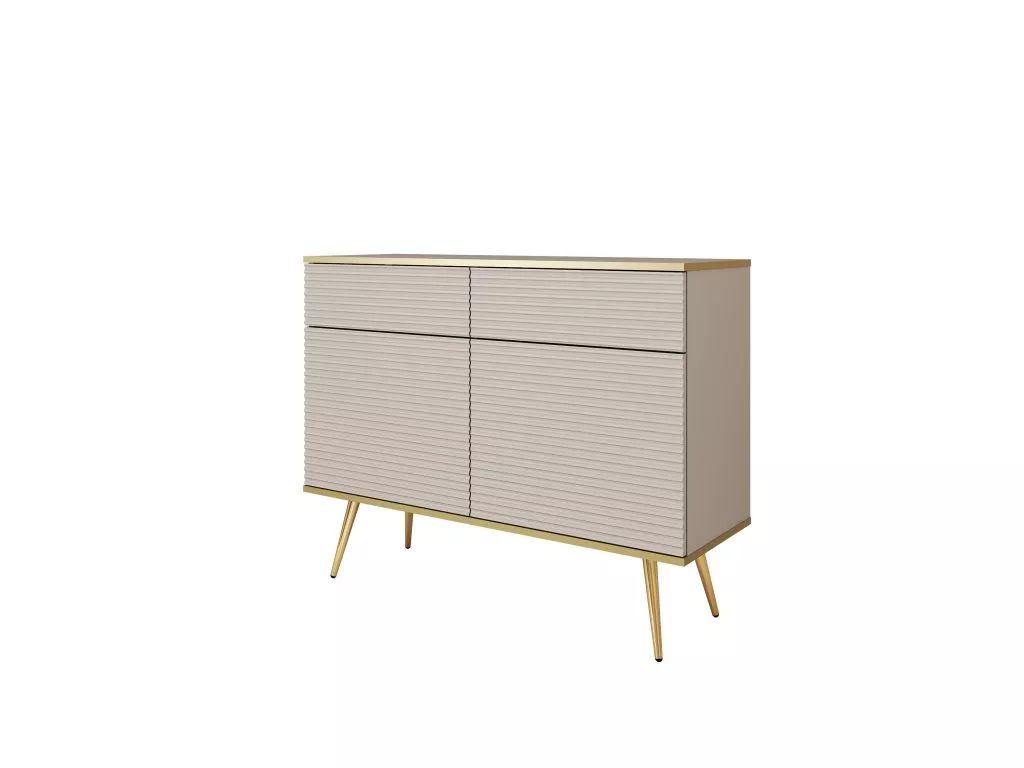 Kombinovaná komoda JENY 2 zaujme svými drážkovanými čely a zlatými detaily. Je vybavená 2 prostornými skříňkami a 2 šuplíky s dostatkem úložného prostoru. Vysoké kovové nožky dodávají komodě lehkost a eleganci.