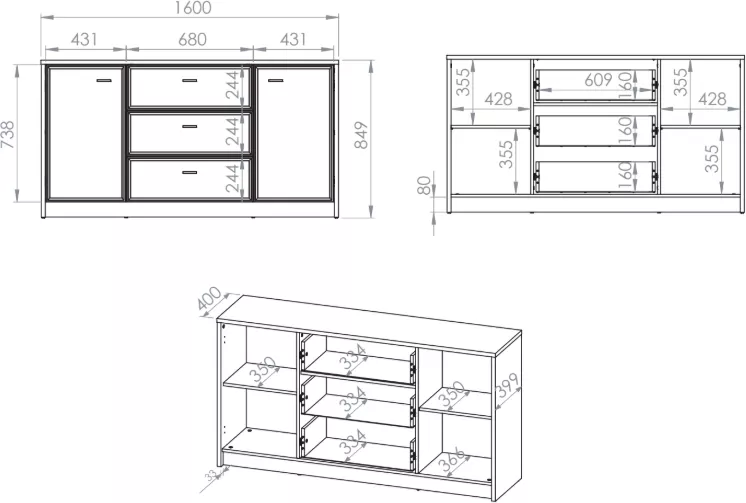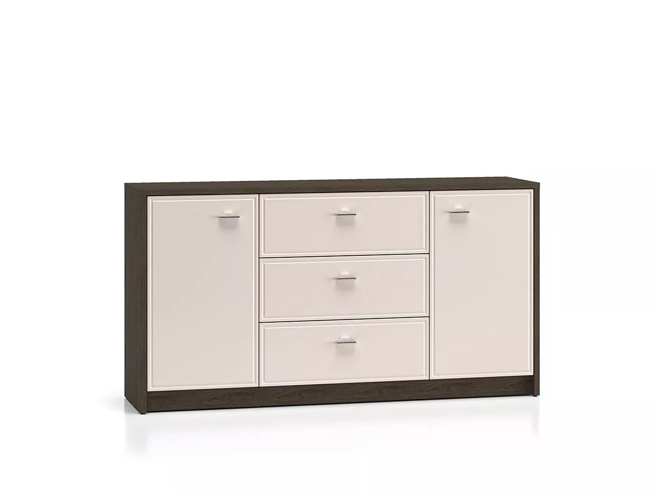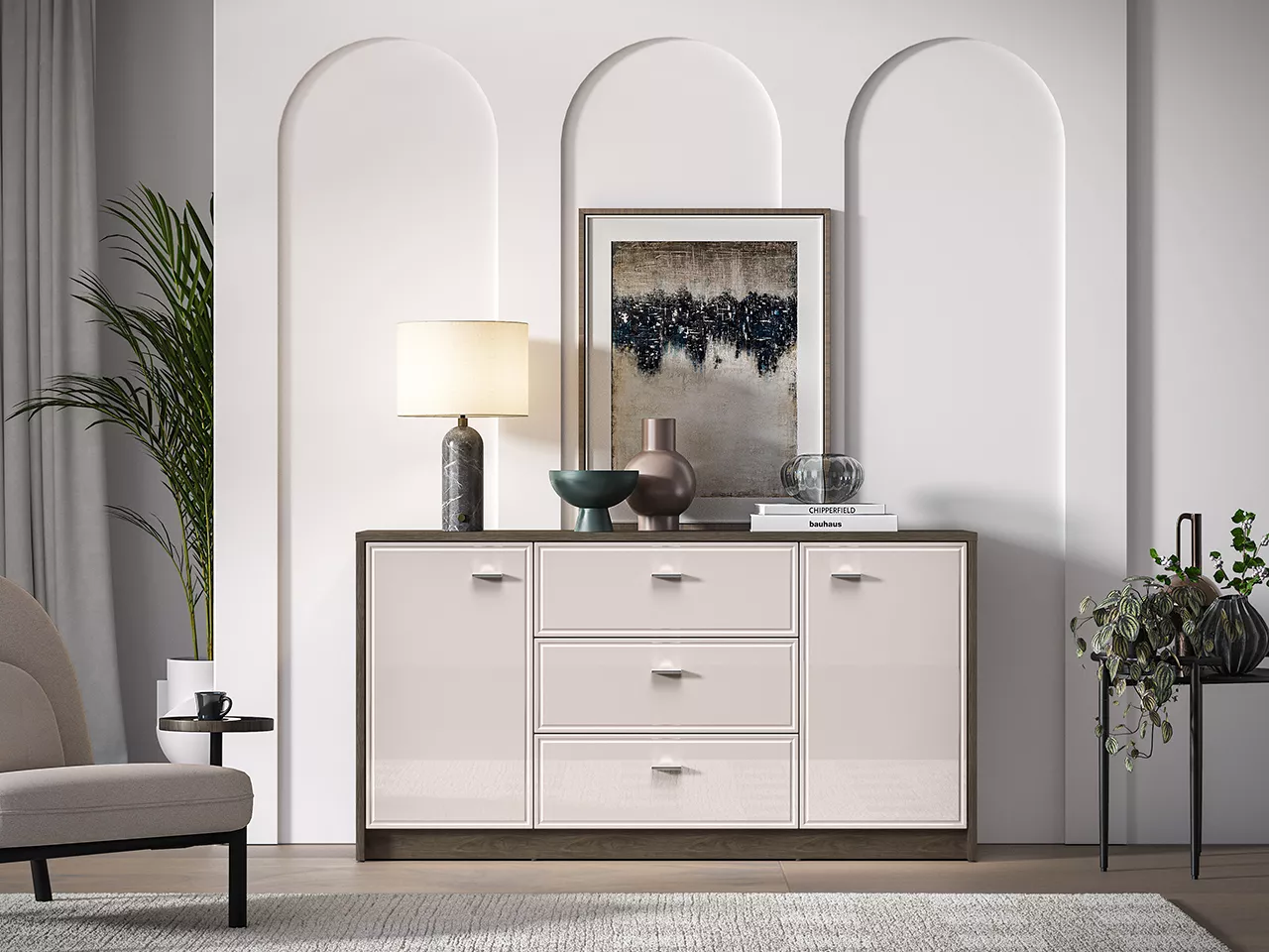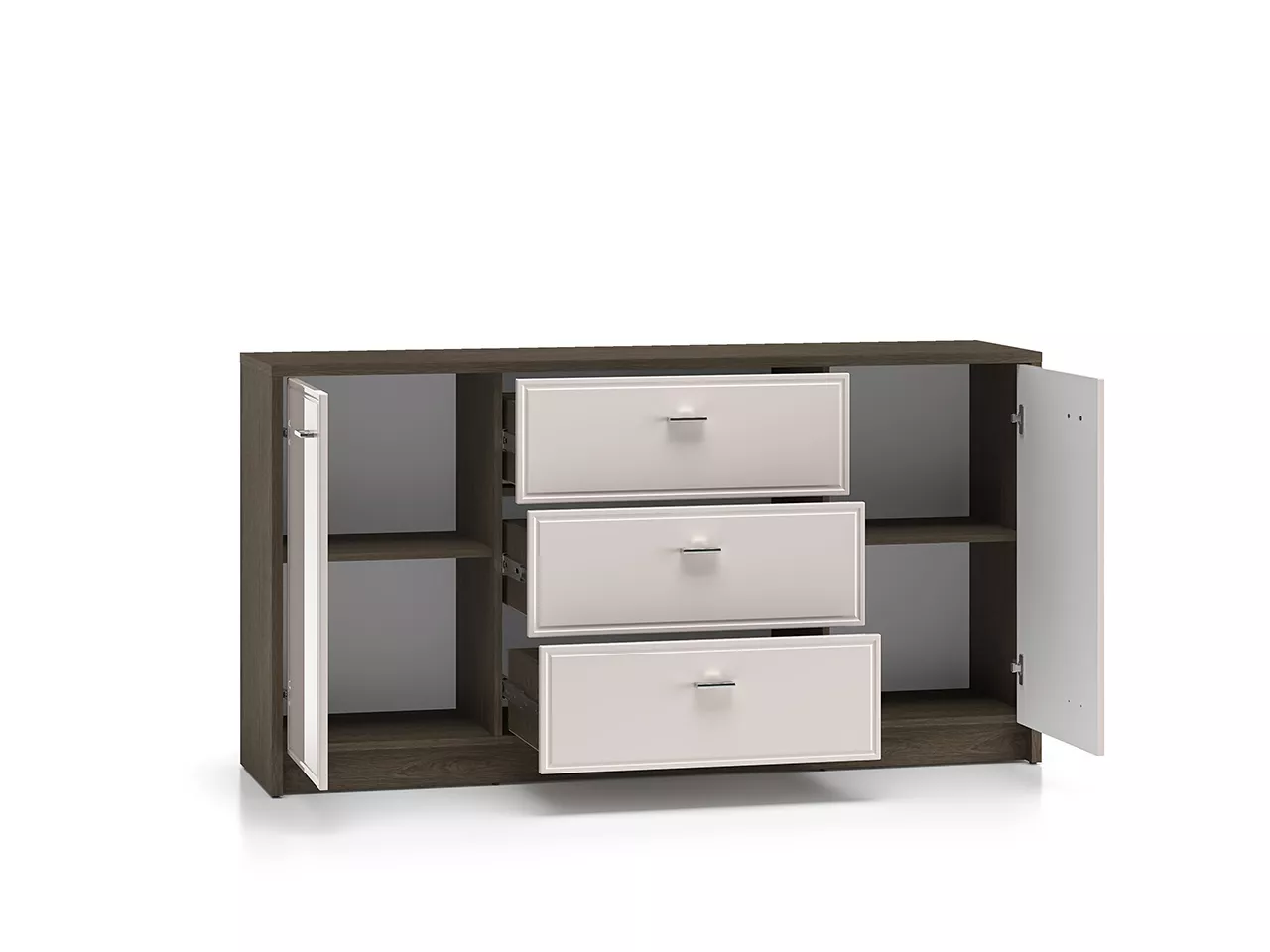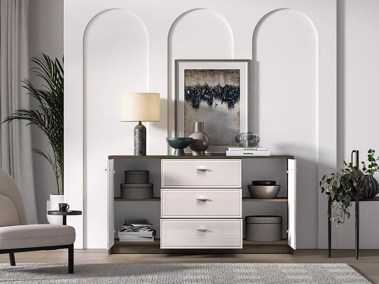 Široká kombinovaná komoda SAFIEH je stylovým i praktickým kouskem nábytku do každého obývacího pokoje nebo ložnice. Disponuje 3 prostornými šuplíky a 2 uzavřenými skříňkami s policí. Systém tichého dovírání zpříjemní každodenní používání.