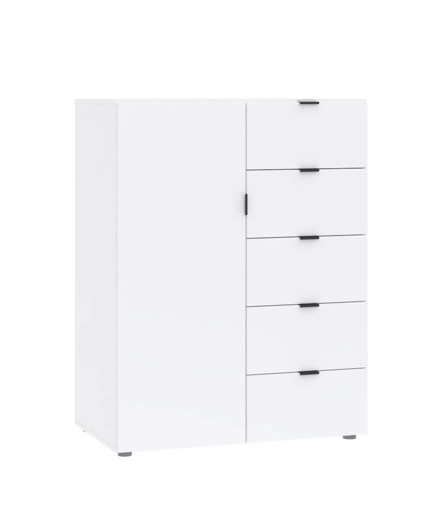 Kombinovaná komoda ZARA se svým minimalistickým zpracováním hodí do všech stylů interiérů. Disponuje 5 prostornými šuplíky a uzavřenou skříňkou s šatní tyčí, na kterou můžete zavěsit menší kousky oblečení nebo jiné potřebné věci.