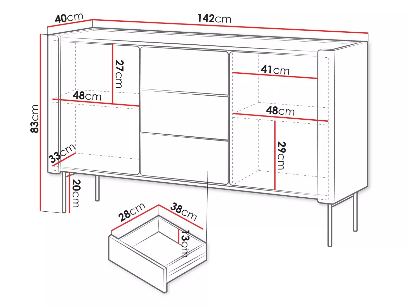 Pořiďte si kombinovanou komodu DEJSY a užijte si spojení elegance a praktičnosti. Atraktivní tvar na vysokých kovových nožičkách s jemnými křivkami dodává lehkost. Prostorné police a šuplíky poskytnou dostatek místa pro různé předměty a systém otevírání PUSH TO OPEN zajistí pohodlný přístup.