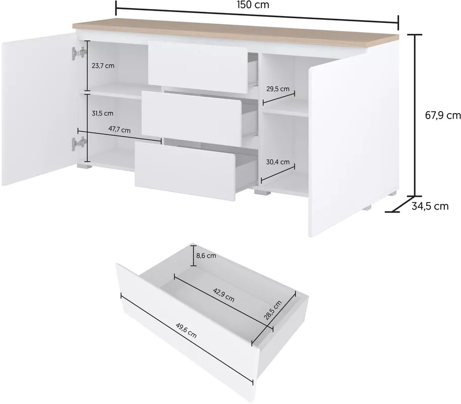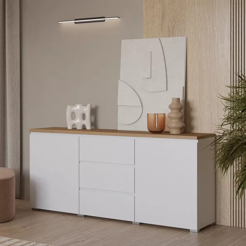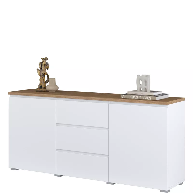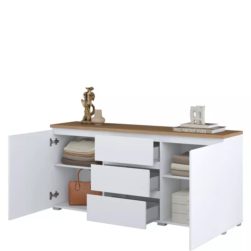 Kombinovaná komoda CAPRI svým jednoduchým designem a dekorem dubu skvěle zapadne do všech skandinávských interiérů. Díky 2 uzavřeným skříňkám a 3 šuplíkům snadno uschováte důležité dokumenty, ubrusy nebo ručníky. Komoda je vyrobená z materiálů odolných proti poškození, takže vám bude sloužit mnoho let.