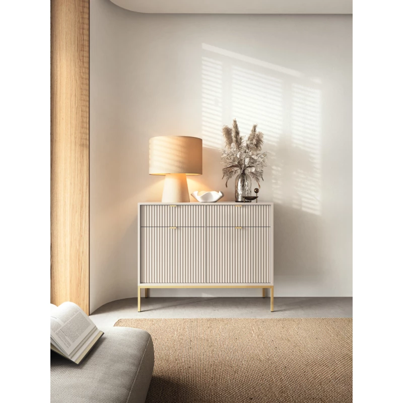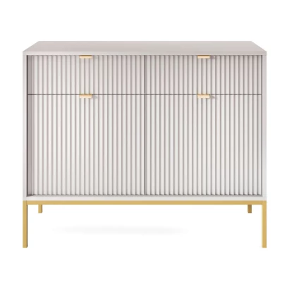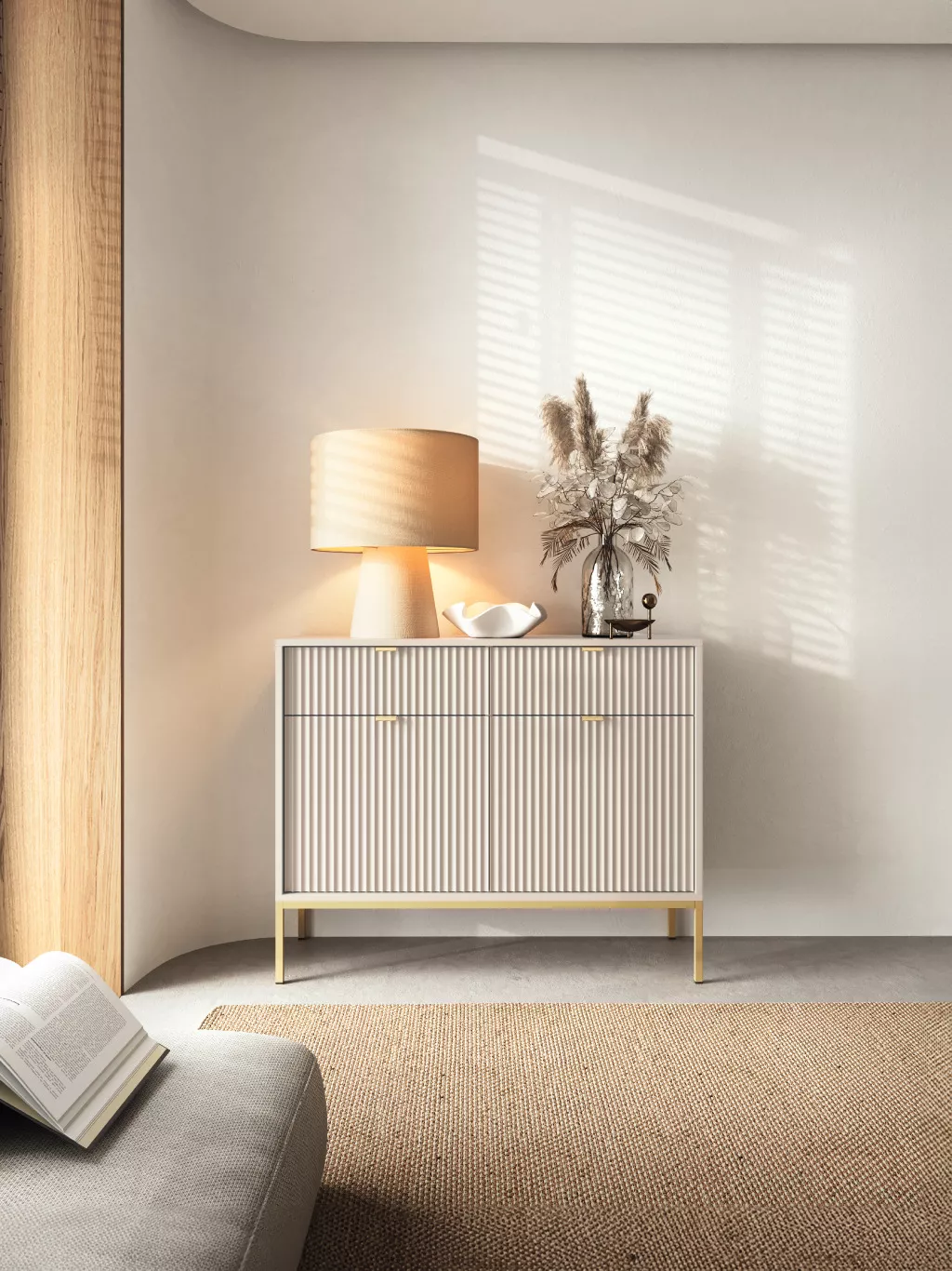 Kombinovaná komoda MISHEEL uchvátí především svým originálním a nadčasovým designem v podobě drážkovaných předních částí šuplíků a dvířek. Skvěle zapadne do obývacích pokojů nebo ložnic. Disponuje šuplíky a skříňkami s policemi pro snadné uschování předmětů.