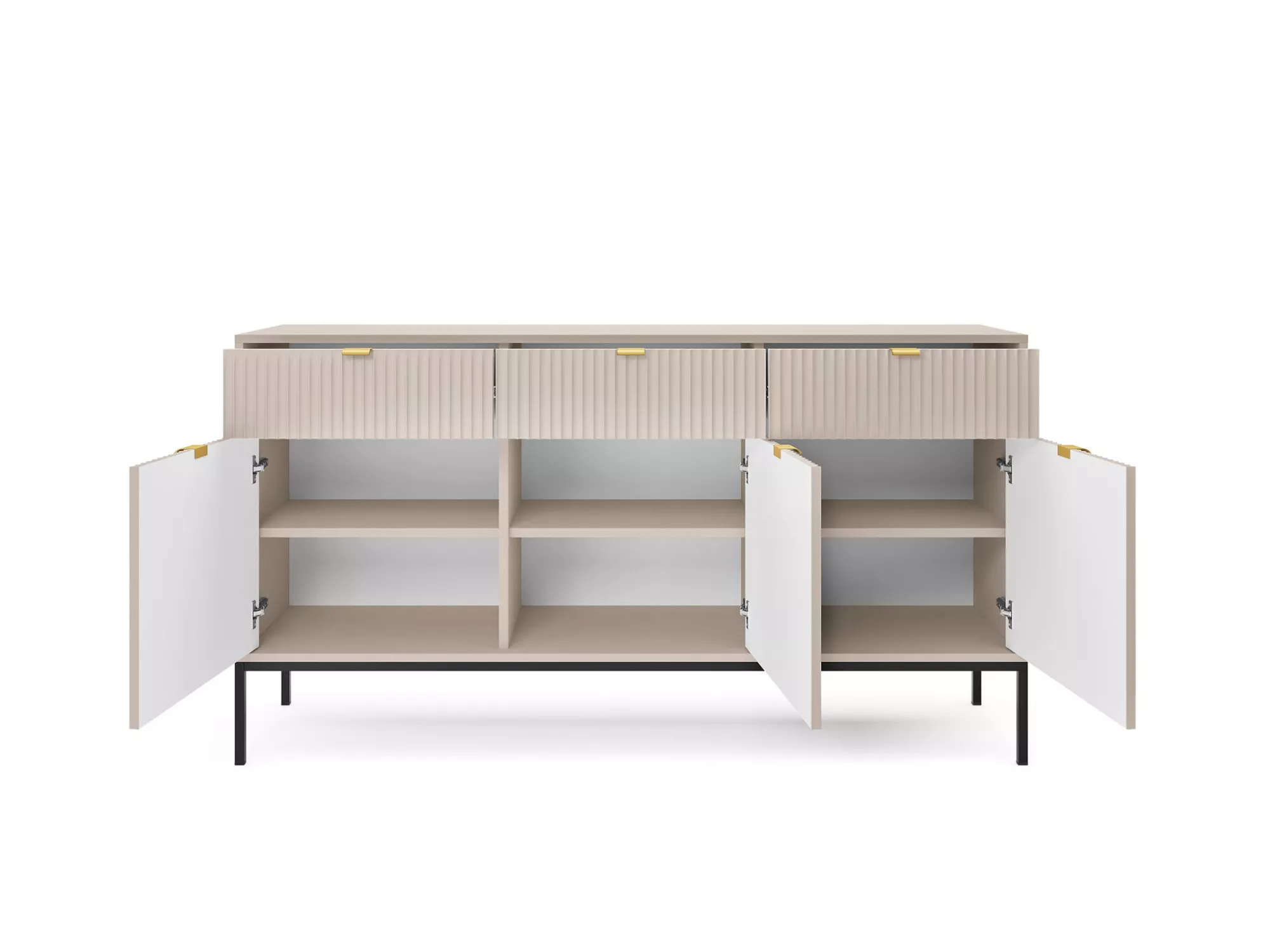Široká kombinovaná komoda MISHEEL uchvátí především svým originálním a nadčasovým designem v podobě drážkovaných předních částí šuplíků a dvířek. Skvěle zapadne do obývacích pokojů nebo ložnic. Disponuje šuplíky a skříňkami s policemi pro snadné uschování předmětů.