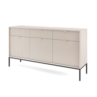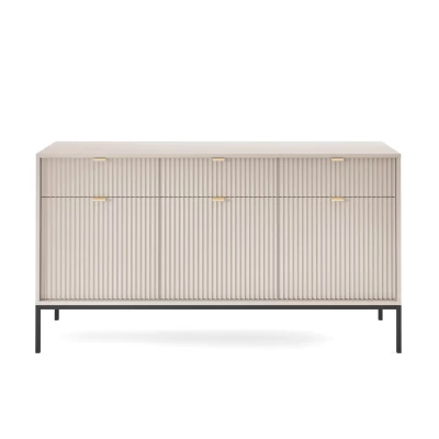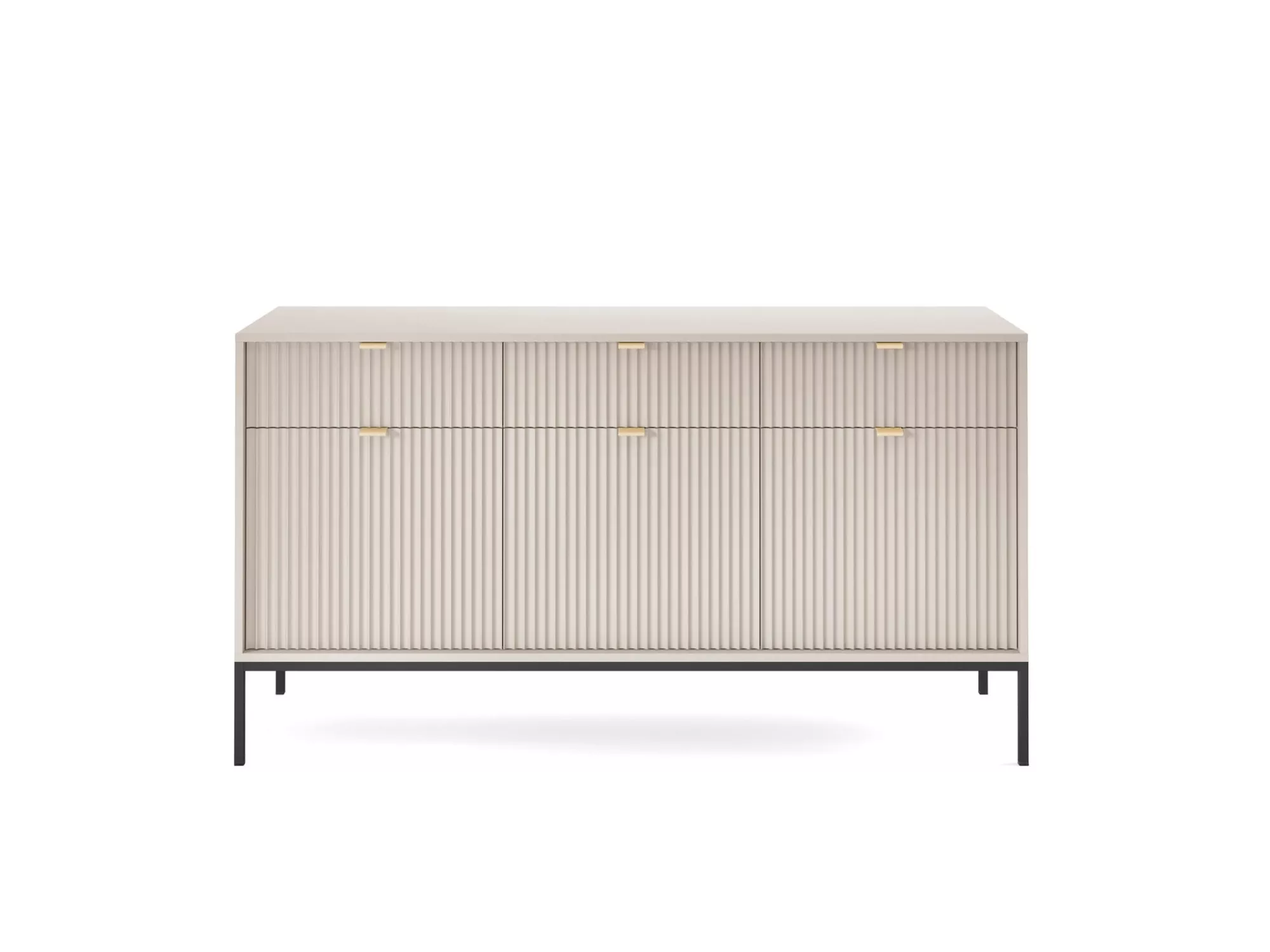 Široká kombinovaná komoda MISHEEL uchvátí především svým originálním a nadčasovým designem v podobě drážkovaných předních částí šuplíků a dvířek. Skvěle zapadne do obývacích pokojů nebo ložnic. Disponuje šuplíky a skříňkami s policemi pro snadné uschování předmětů.