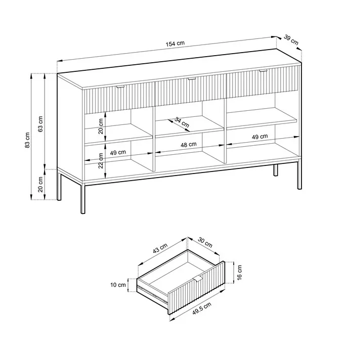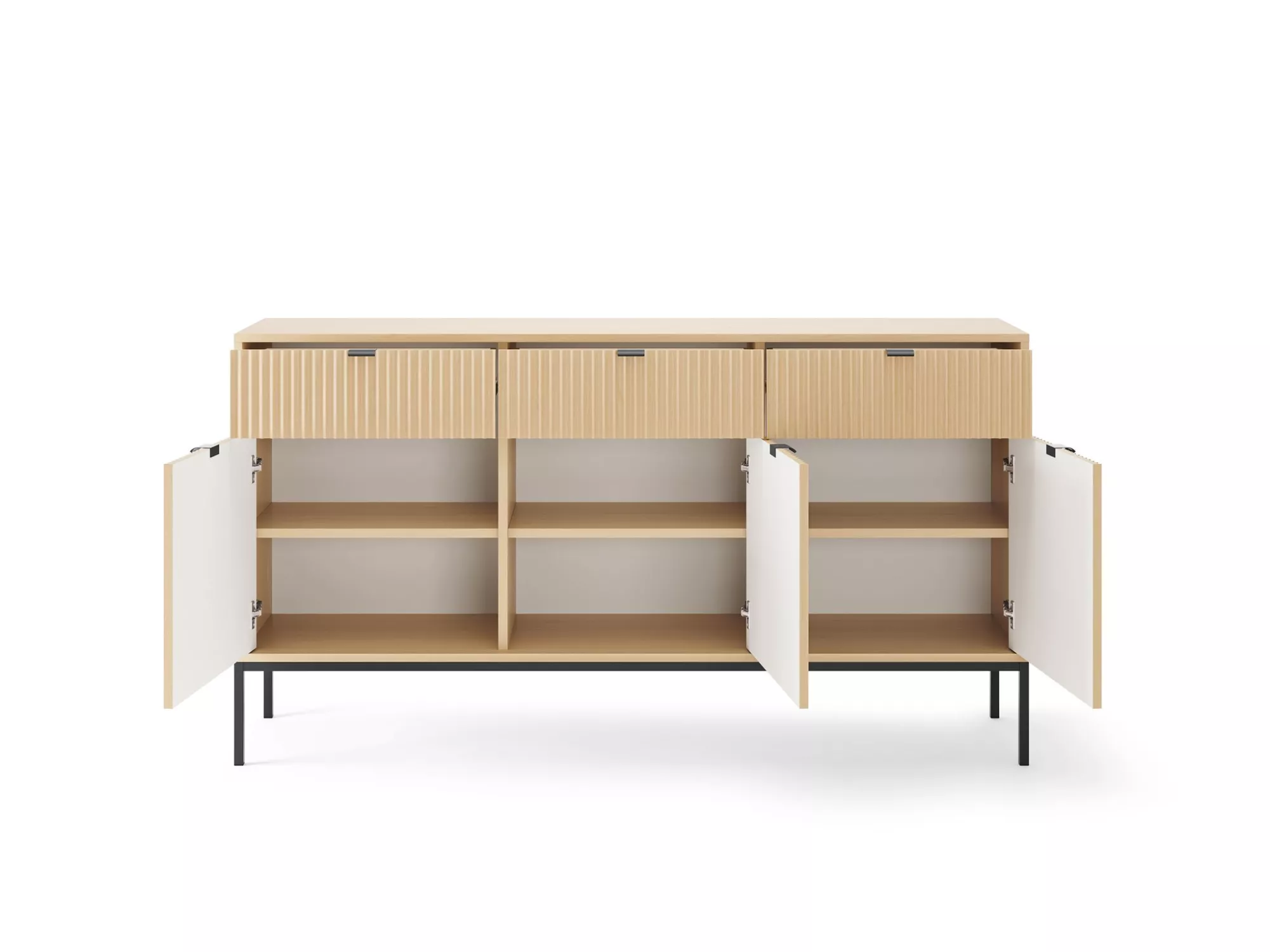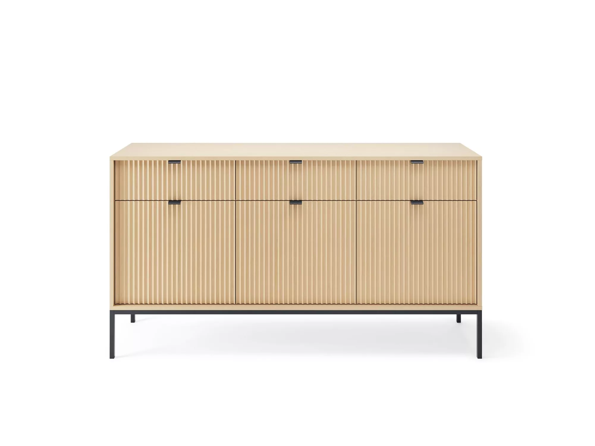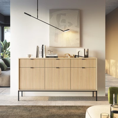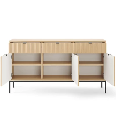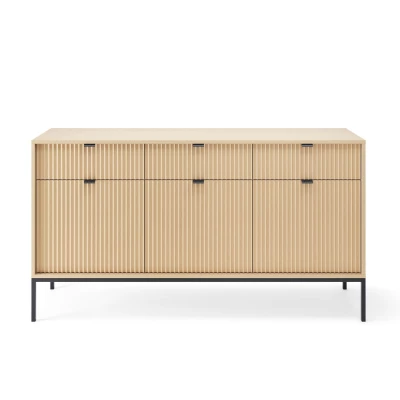 Široká kombinovaná komoda MISHEEL uchvátí především svým originálním a nadčasovým designem v podobě drážkovaných předních částí šuplíků a dvířek. Skvěle zapadne do obývacích pokojů nebo ložnic. Disponuje šuplíky a skříňkami s policemi pro snadné uschování předmětů.