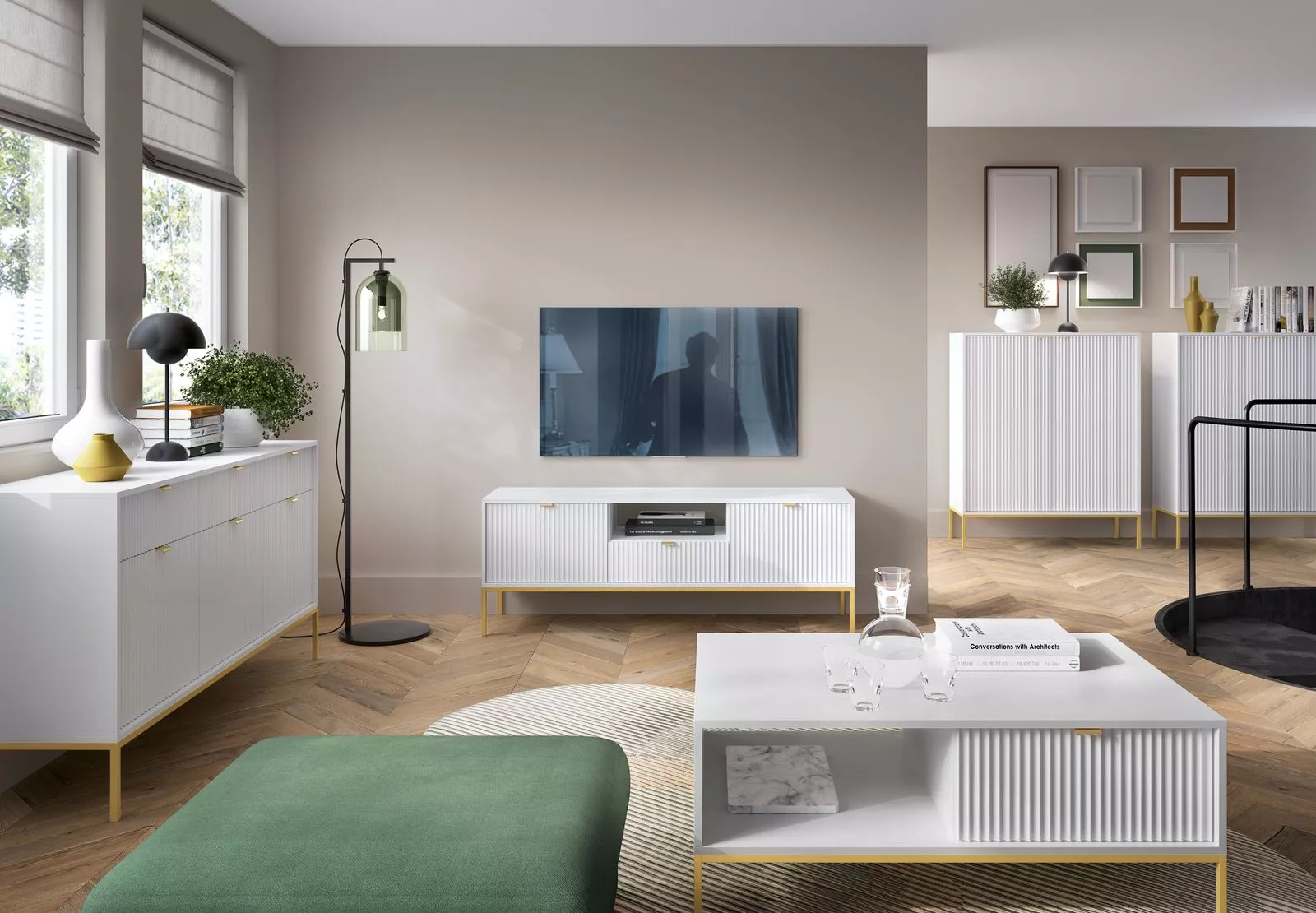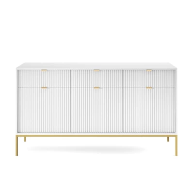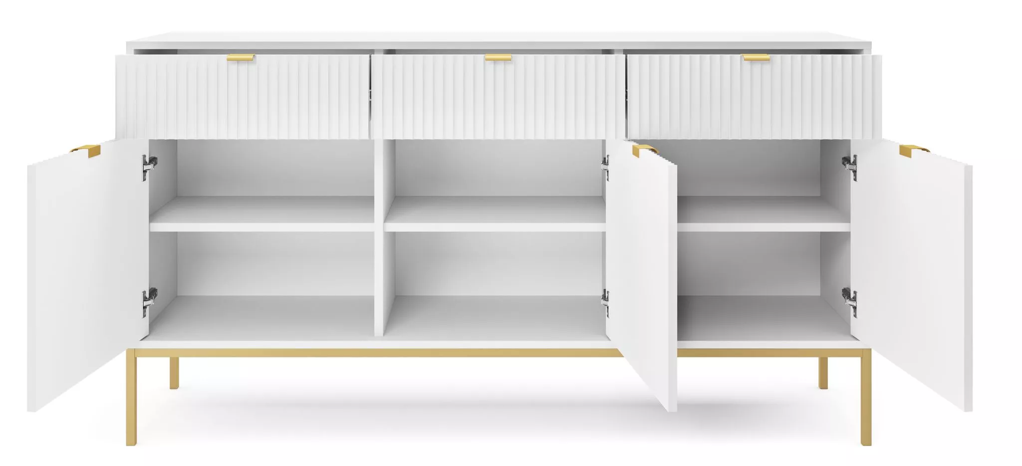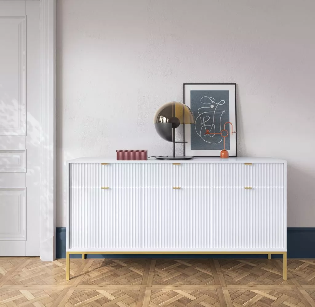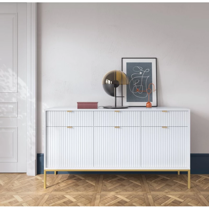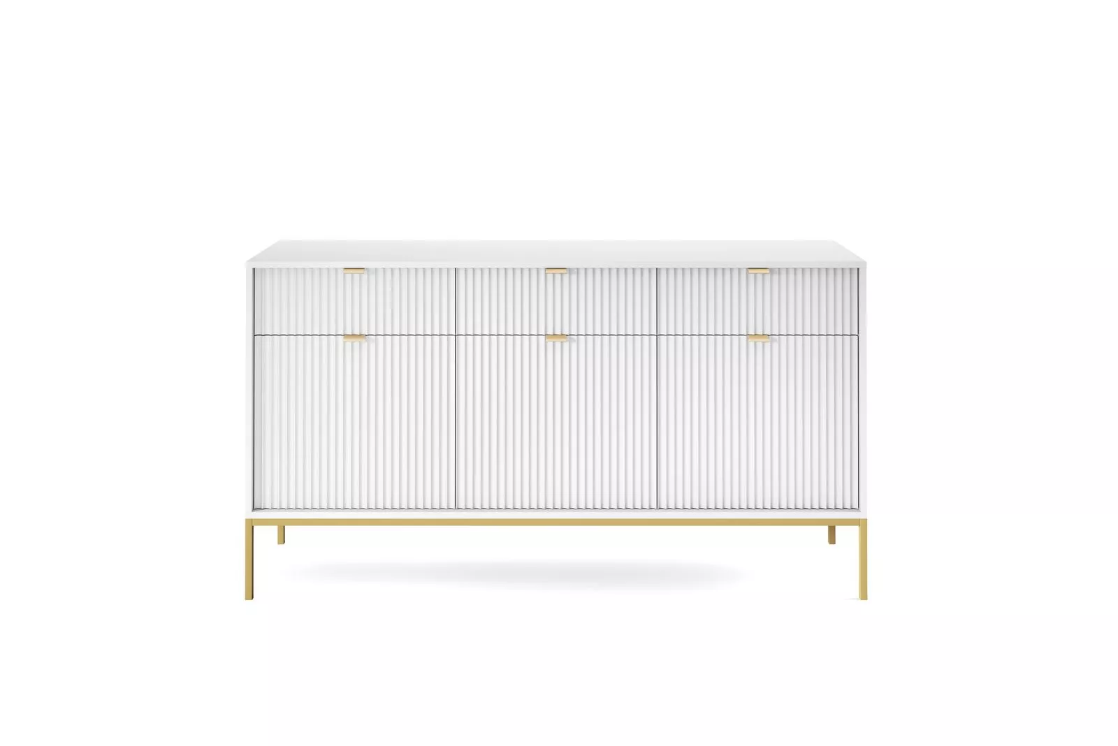 Široká kombinovaná komoda MISHEEL uchvátí především svým originálním a nadčasovým designem v podobě drážkovaných předních částí šuplíků a dvířek. Skvěle zapadne do obývacích pokojů nebo ložnic. Disponuje šuplíky a skříňkami s policemi pro snadné uschování předmětů.