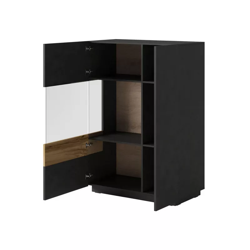 Luxusní komoda v moderním stylu ve 3 jedinečných dekorech, které vznikly v souladu s nejnovějšími trendy. Vitrína je vyrobená z kvalitní LTD desky s ochrannými ABS lištami. Povrch dvířek je potažený lesklou fólií, která zaručí snadnou péči a údržbu. Ať už zvolíte jakékoliv barevné provedení, Váš obývací pokoj bude vypadat naprosto luxusně.