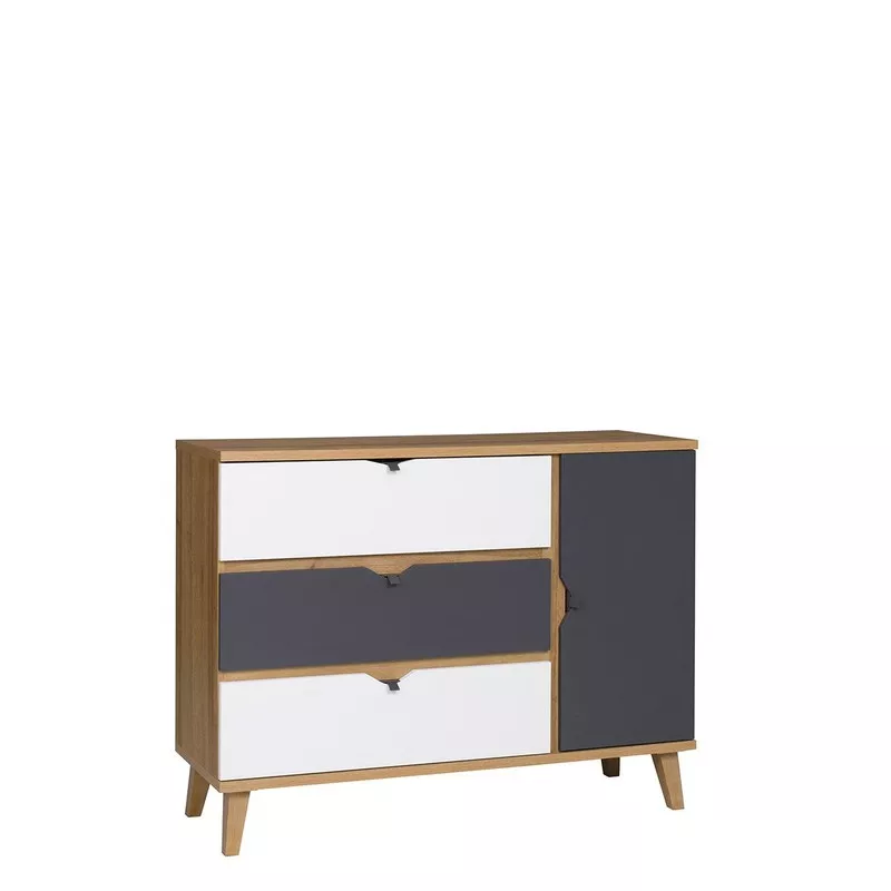 Praktická komoda VISTA je vyrobena ve skandinávském stylu, který kombinuje trochu strohosti a minimalismu s moderním charakterem. Je vybavena hlubokými zásuvkami a skříňkou, které vytváří praktický a prostorný kus nábytku, který nalezne své využití v ložnici, jídelně nebo obývacím pokoji. Vysoká kvalita použitých materiálů zaručuje dlouholeté používání bez problémů.