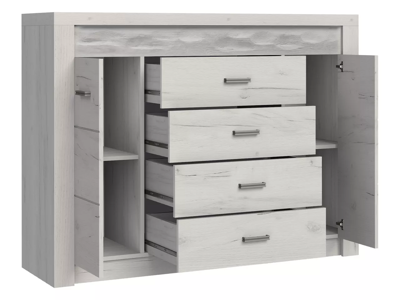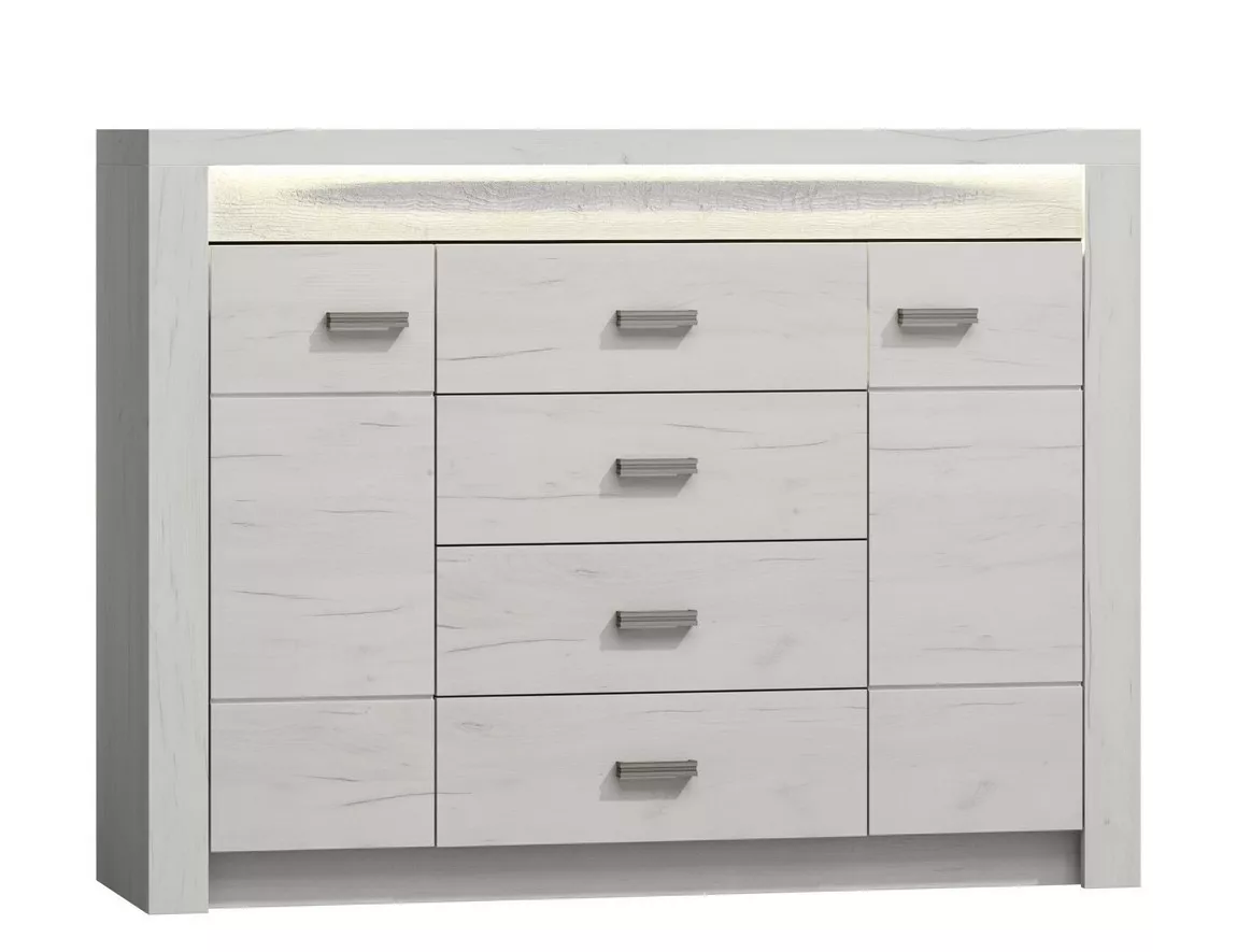 Kombinovaná komoda CHALAPATA najde své využití v každém moderním interiéru. V prostorných zásuvkách a skříňkách lze snadno ukládat jakékoliv předměty, včetně studijního materiálu či sezónního oblečení. Komoda je vybavena praktickým LED bílým osvětlením.
