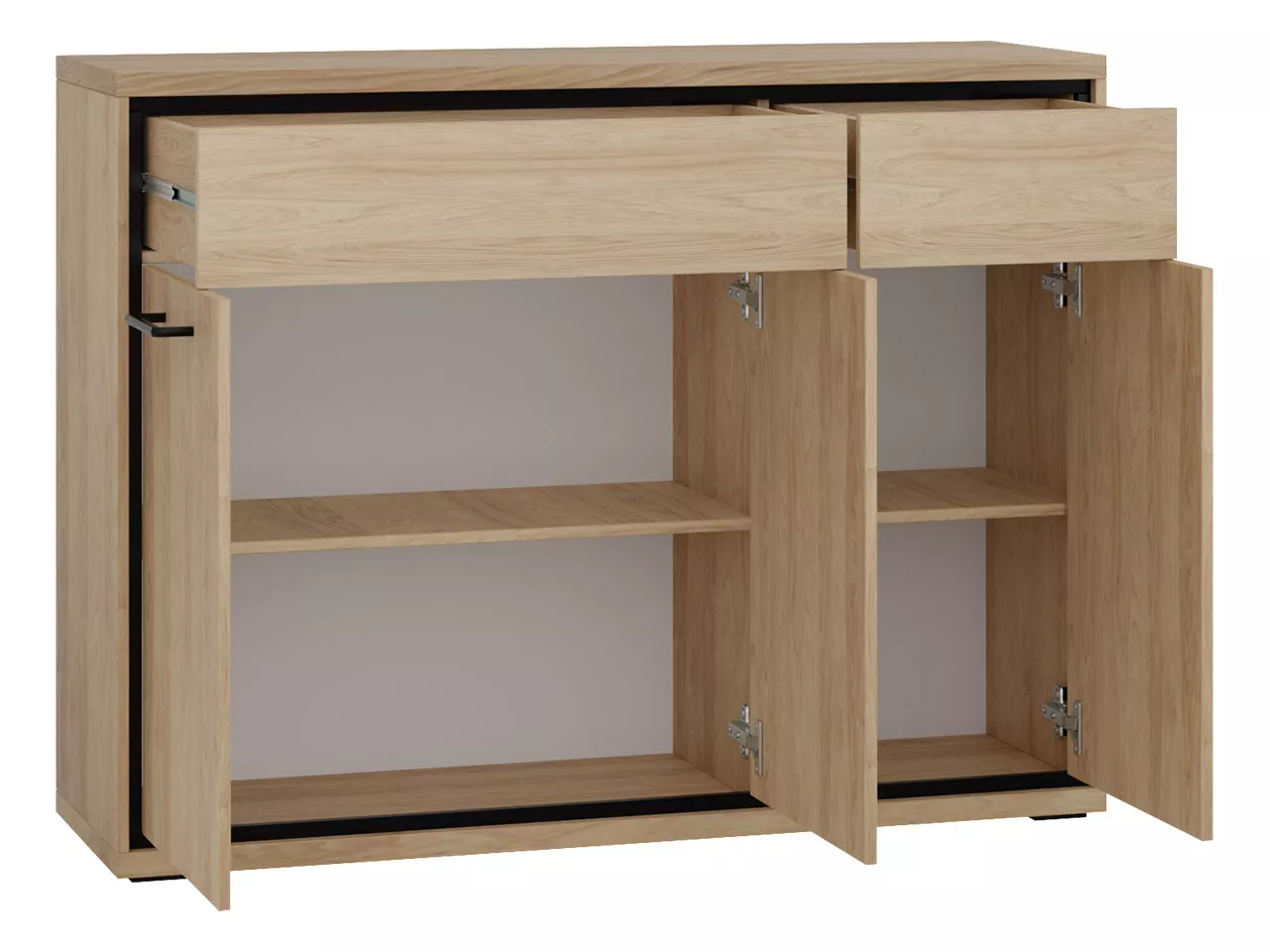 Kombinovaná komoda na nožkách SUCRE 2 najde své využití v každém moderním interiéru. V prostorných skříňkách a zásuvkách lze snadno ukládat jakékoliv předměty, včetně studijního materiálu či sezónního oblečení. Komoda je vybavena technologií "PUSH TO OPEN", pomocí které lze otevřít zásuvky. Tento inovativní systém otevírání spočívá v mírném stlačení předních částí. Skříňky se otevírají pomocí kovových úchytů v černé barvě. Komoda je navíc vybavena praktickým bílým LED osvětlením. SUCRE 2 je vyrobena z kvalitní LTD desky v přírodním odstínu dřeva.