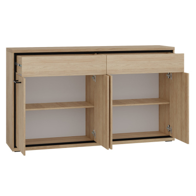 Kombinovaná komoda SUCRE 3 najde své využití v každém moderním interiéru. V prostorných skříňkách a zásuvkách lze snadno ukládat jakékoliv předměty, včetně studijního materiálu či sezónního oblečení. Komoda je vybavena technologií "PUSH TO OPEN", pomocí které lze otevřít zásuvky. Tento inovativní systém otevírání spočívá v mírném stlačení předních částí. Skříňky se otevírají pomocí kovových úchytů v černé barvě. Komoda je navíc vybavena praktickým bílým LED osvětlením. SUCRE 3 je vyrobena z kvalitní LTD desky v přírodním odstínu dřeva.