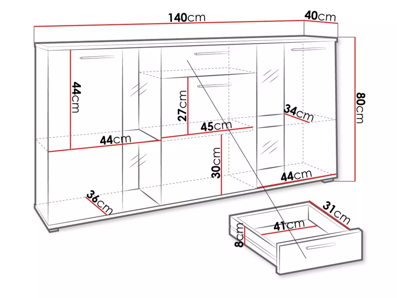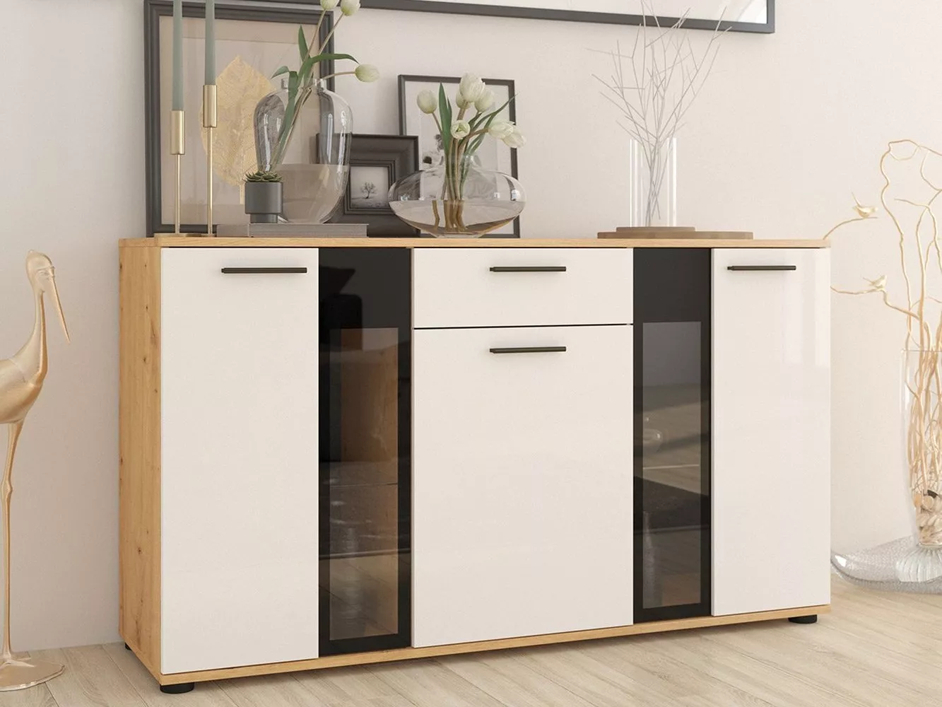 Stylová komoda Sana bude ozdobou každé místnosti. Kromě atraktivního vzhledu oceníte dostatek místa k ukládání věcí, prosklené části využijete k vystavení dekorací. Komoda je vyrobena z LTD desky, která vyniká odolností vůči poškrábání.