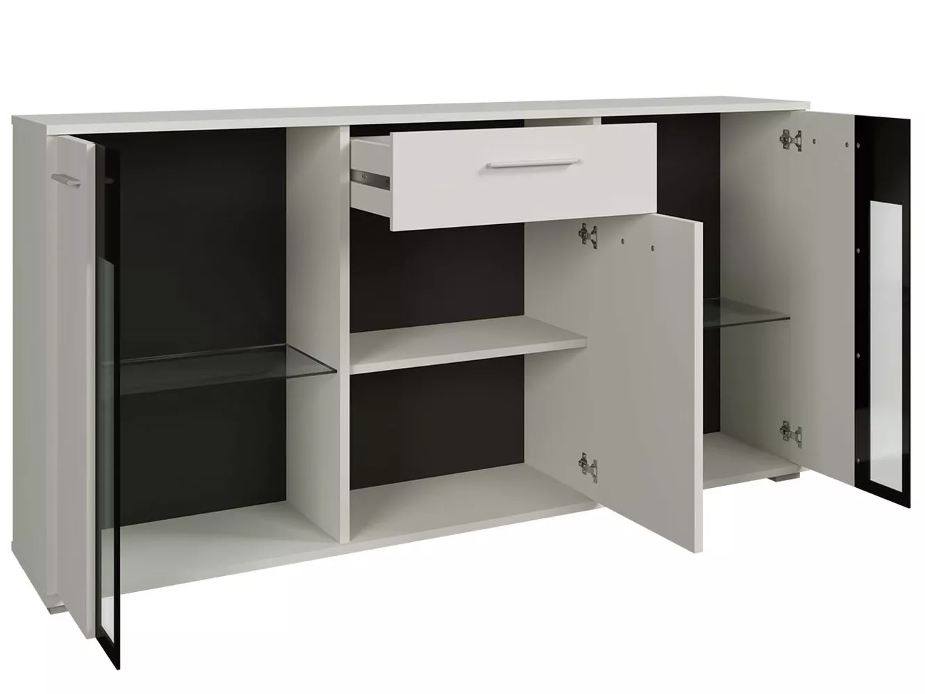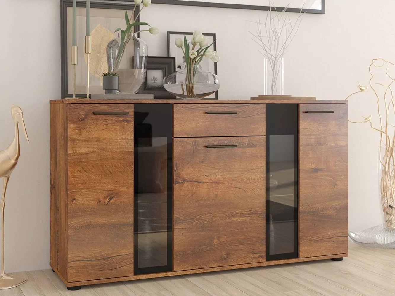 Stylová komoda Sana bude ozdobou každé místnosti. Kromě atraktivního vzhledu oceníte dostatek místa k ukládání věcí, prosklené části využijete k vystavení dekorací. Komoda je vyrobena z LTD desky, která vyniká odolností vůči poškrábání.