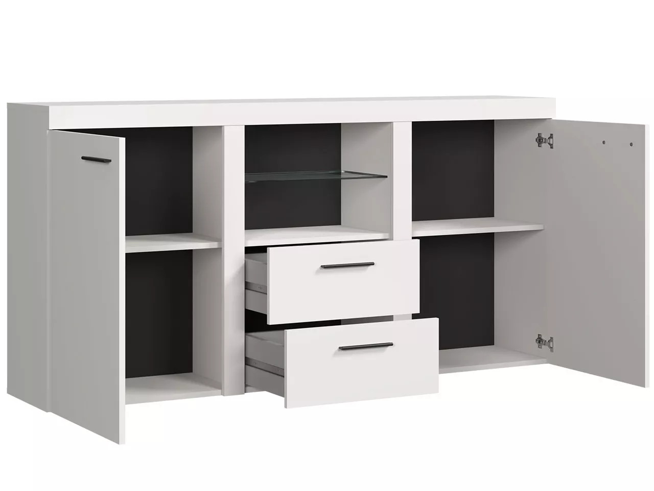 Moderní kombinovaná komoda THISE spojuje minimalismus a vysokou funkčnost. Je vybavena skříňkami, šuplíky a otevřenými poličkami, které poslouží pro úschovu domácích doplňků a vystavení dekorací. Poličky navíc doplňuje inovativní LED osvětlení.