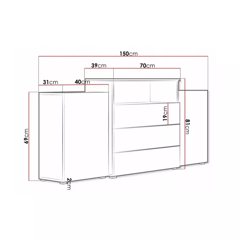 Kombinovaná komoda POSIE nabízí dostatek úložného prostoru. 2 šuplíky disponují funkcí „push to open“. Hrany komody jsou osazeny ABS.