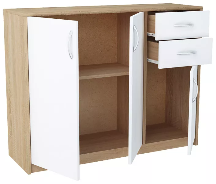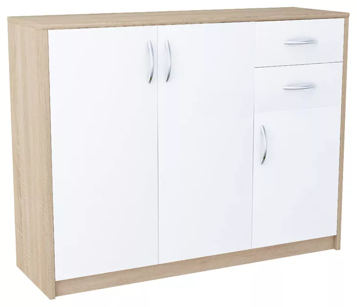 Praktická komoda IBOJA je vybavena válečkovými pojezdy, díky nimž mají zásuvky hladký chod a maximální výsuv. Úložný prostor tvoří kombinace 3 dveří a 2 zásuvek, které jsou opatřeny úzkými úchyty. Dostatek prostoru poskytuje i horní deska komody.