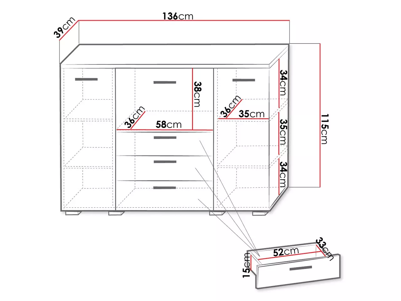 - materiál konstrukce a zásuvek: DTD v matné barvě