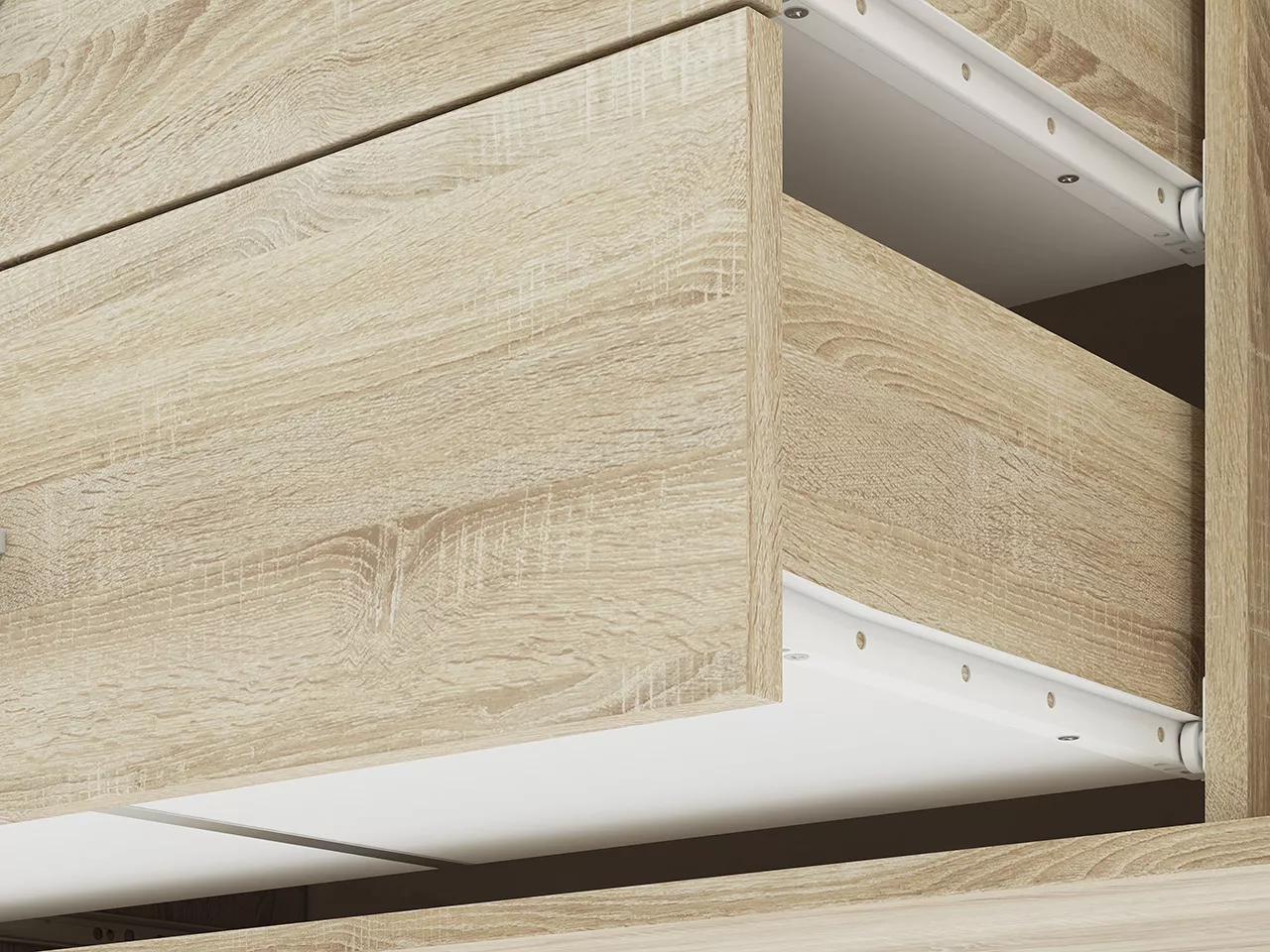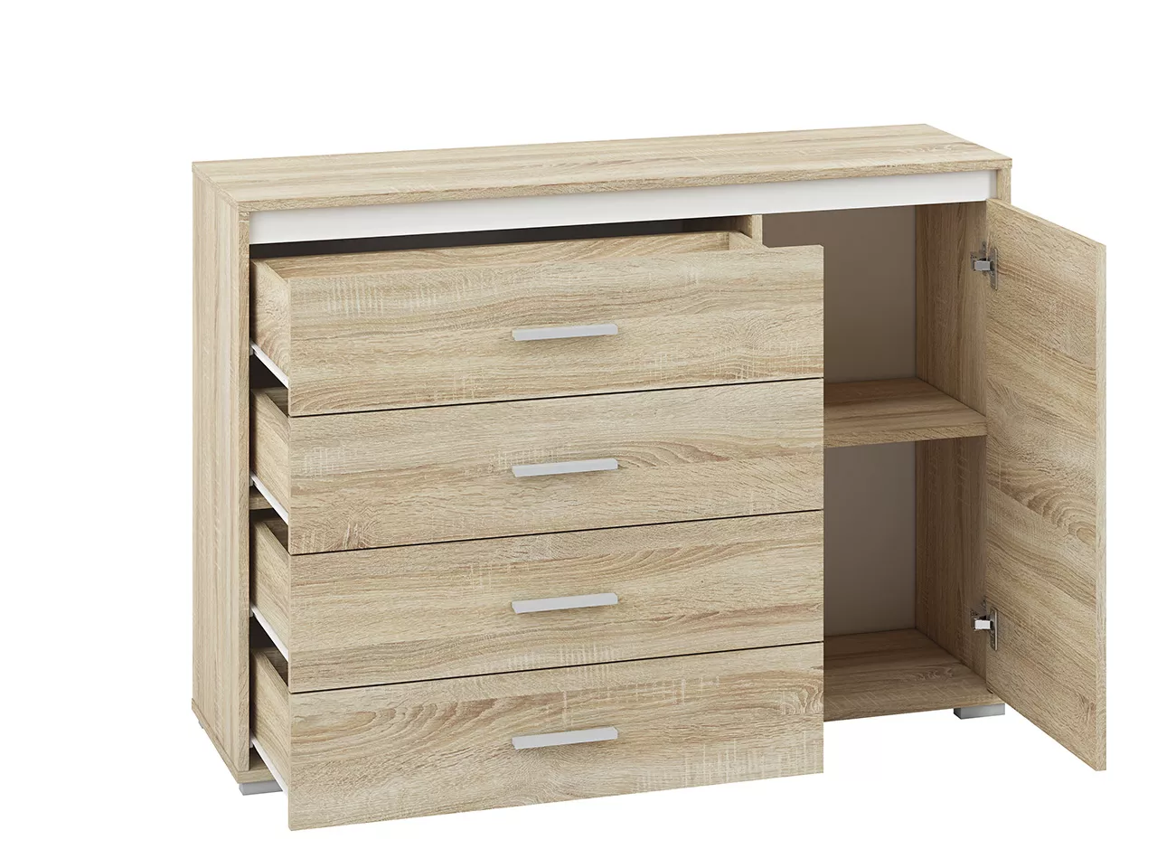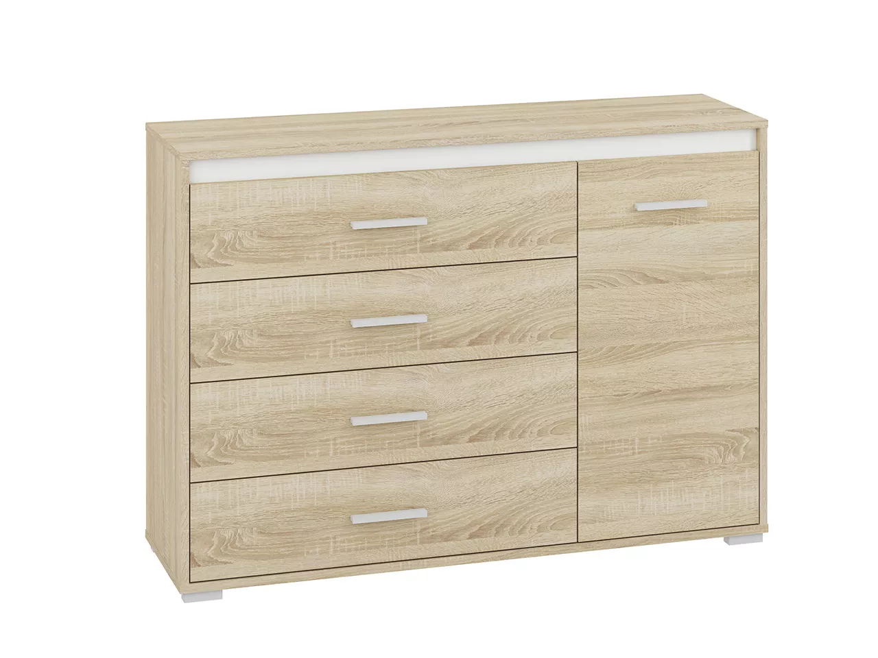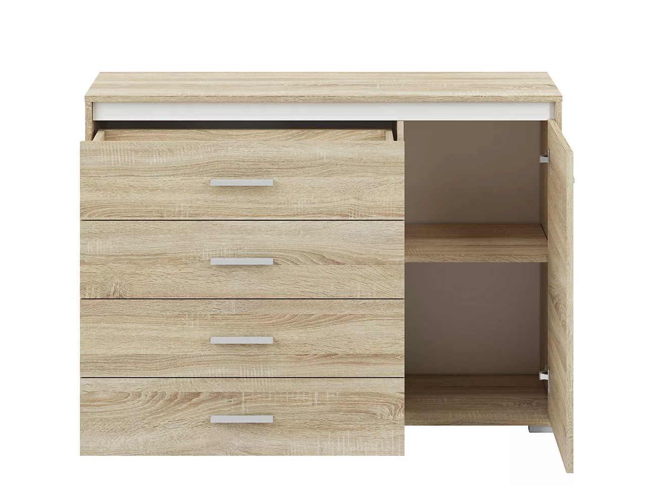 Kombinovaná komoda GVENDA se hodí do všech moderních obývacích pokojů či ložnic. Disponuje 4 šuplíky a 2 přihrádkami. Součástí jsou 3 lišty (bílá, antracit a světlá sonoma), kterými si můžete měnit vzhled vašeho pokoje bez nutnosti výměny nábytku.