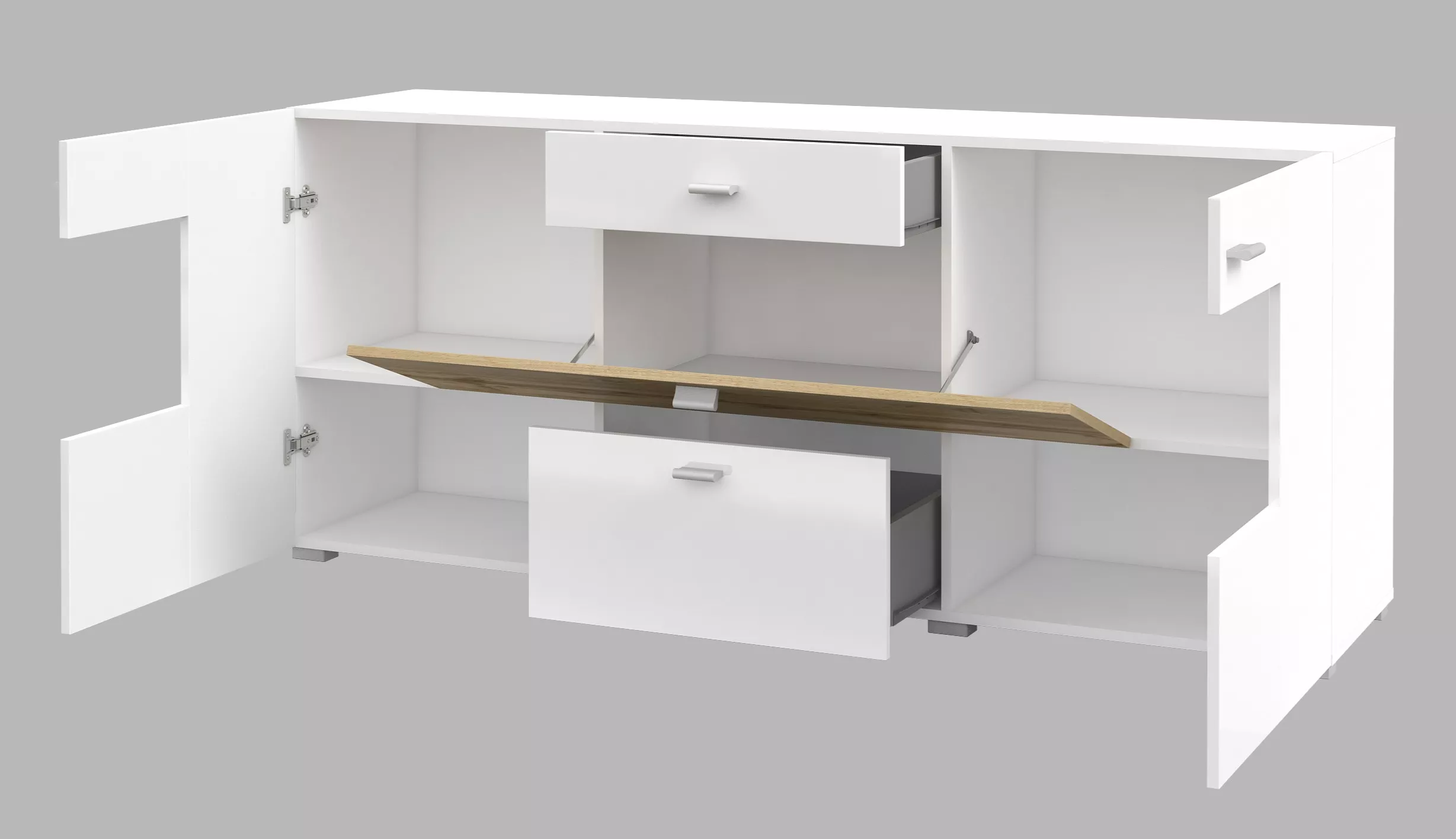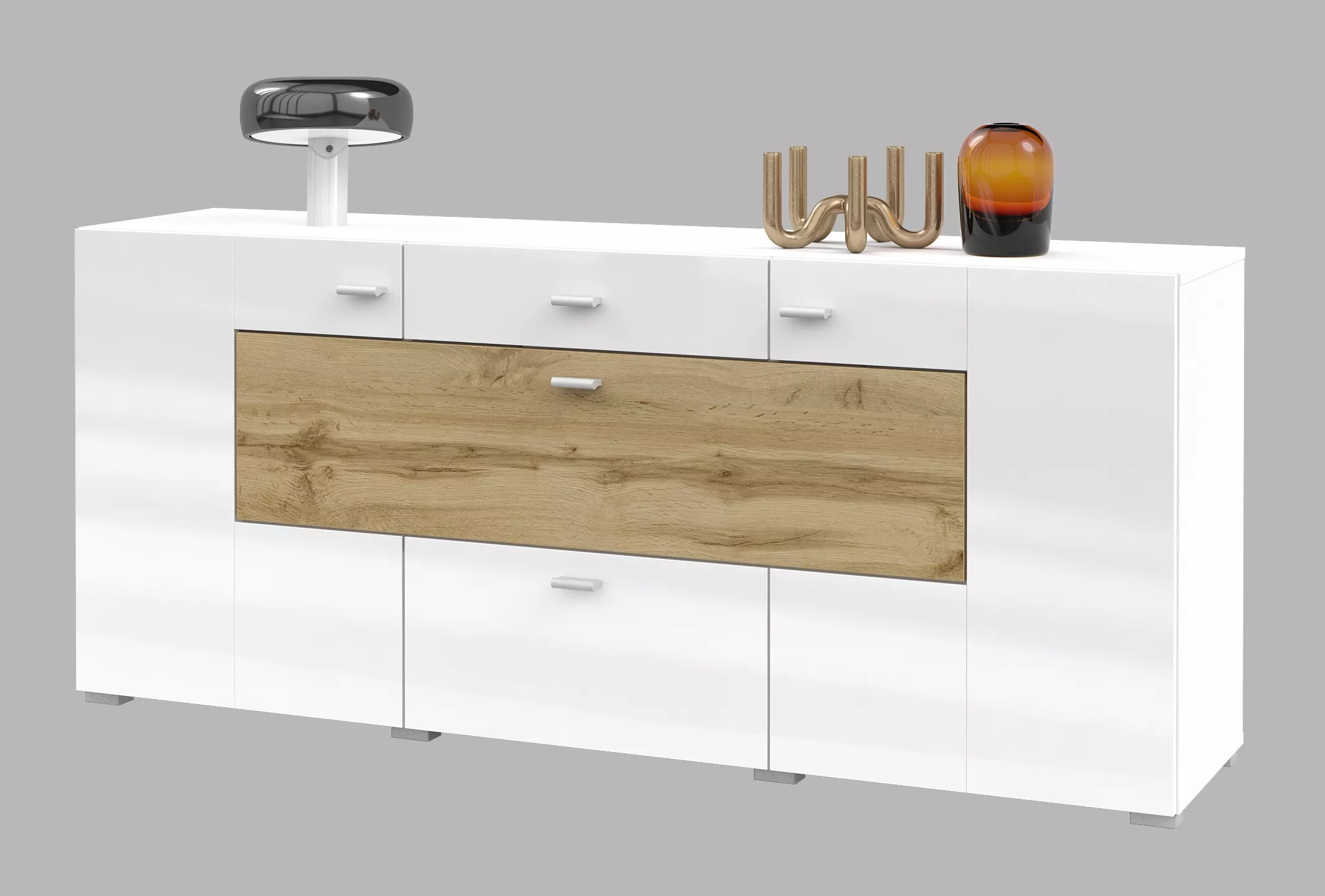 Široká kombinovaná komoda NIKOL - bílá / lesklá bílá / dub wotan