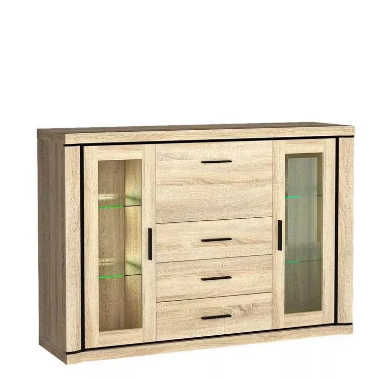 Prosklená komoda AIRA je kombinací industriálního designu s dekorem v teplých barvách, což vytváří mimořádně originální styl. Skládá ze 3 zásuvek, dolů otevírané barové skříňky a 2 prosklených skříněk.