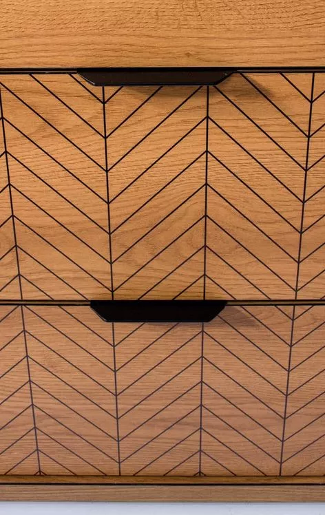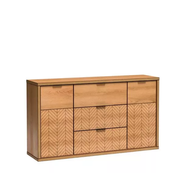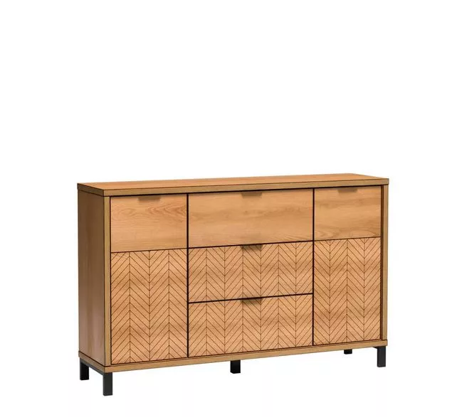 DELA je moderní dvoudveřová komoda se 3 zásuvkami a 2 postranními uzavřenými skříňkami. Charakteristickým znakem komody jsou dekorativní výřezy na dvířkách. Dub karamel je elegantní a estetická barva, která vašemu interiéru přidá nádech přírody.