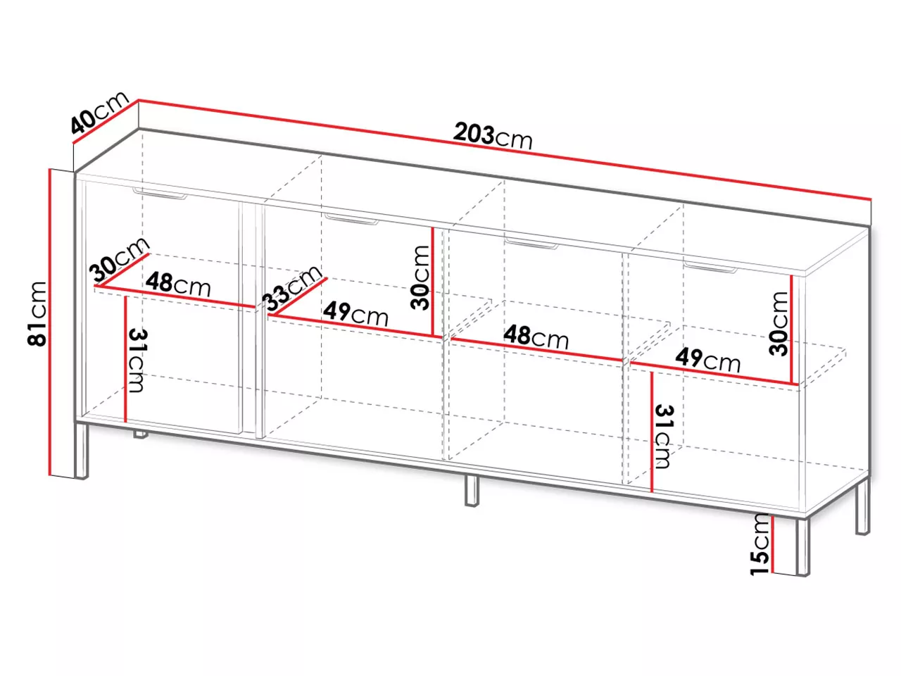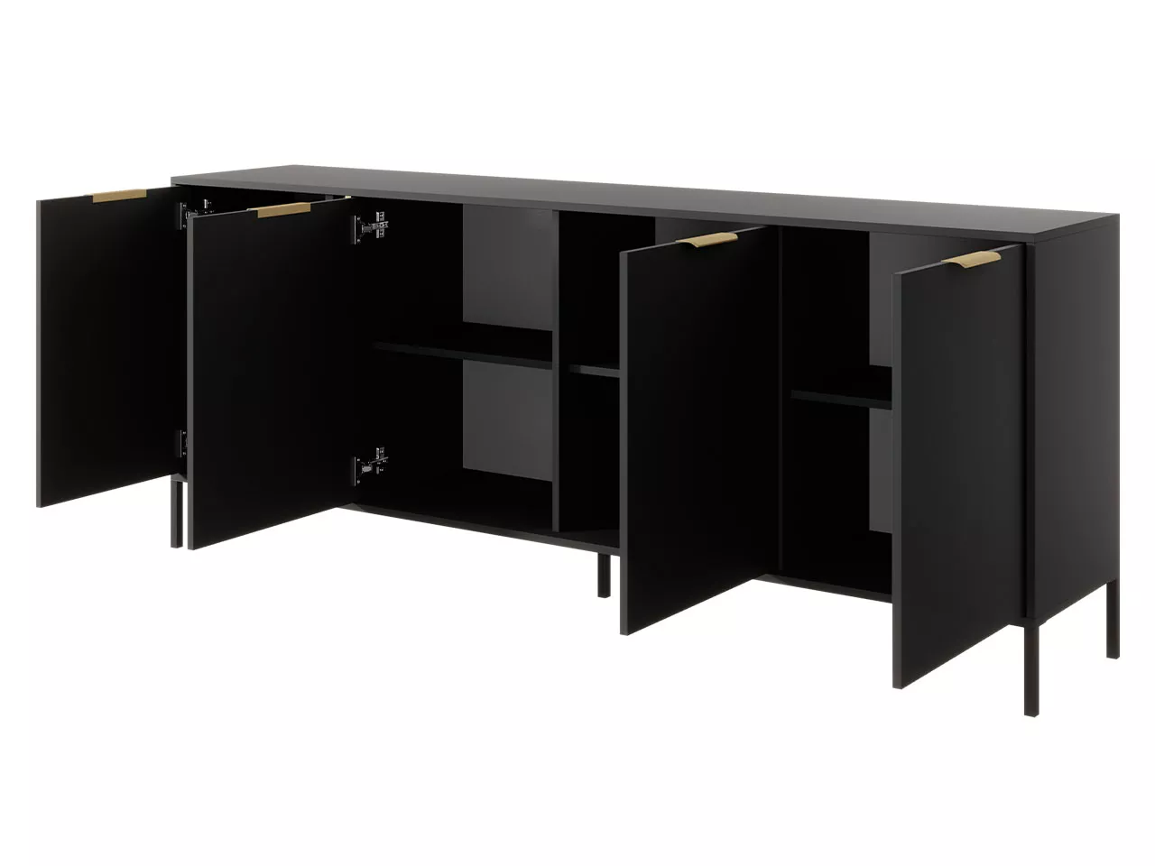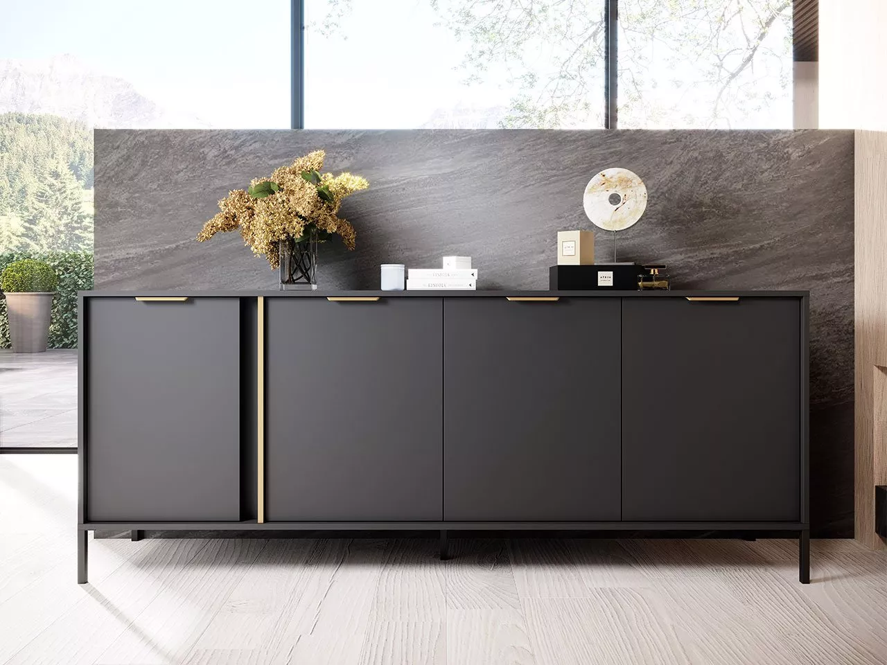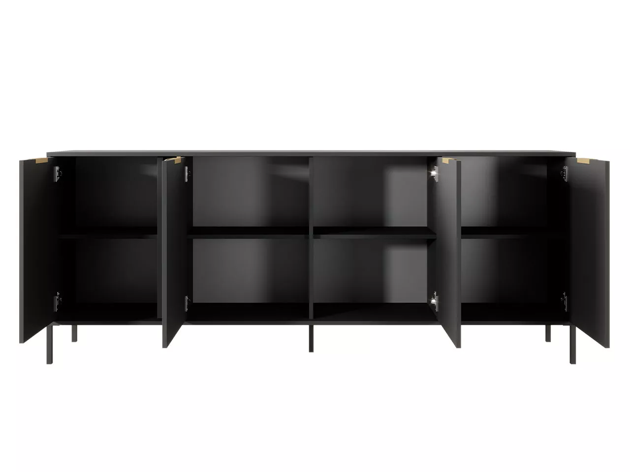 Komoda s dvířky NUCOR 2 je navržena s maximální pečlivostí a s důrazem na ty nejmenší detaily. Je vybavena prostornými policemi v uzavřených skříňkách. Tmavá barva dodává interiéru modernost i klasiku, zlaté detaily zdobící komodu dodávají rafinovaný důraz.