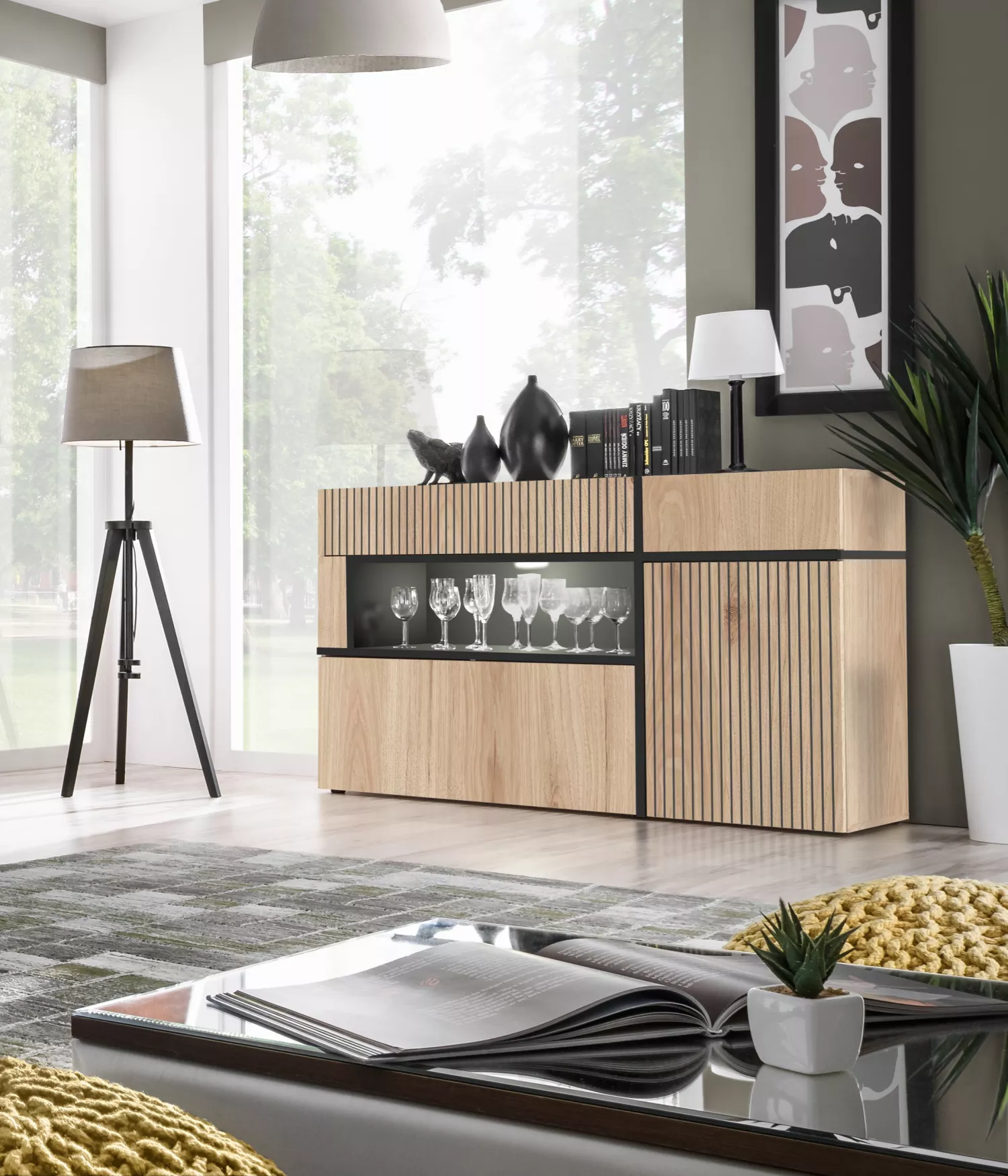 Kombinovaná komoda CELINE oživí váš obývací pokoj. Využijte kombinaci šuplíků, skříněk a poličky, která je vybavena LED osvětlením.