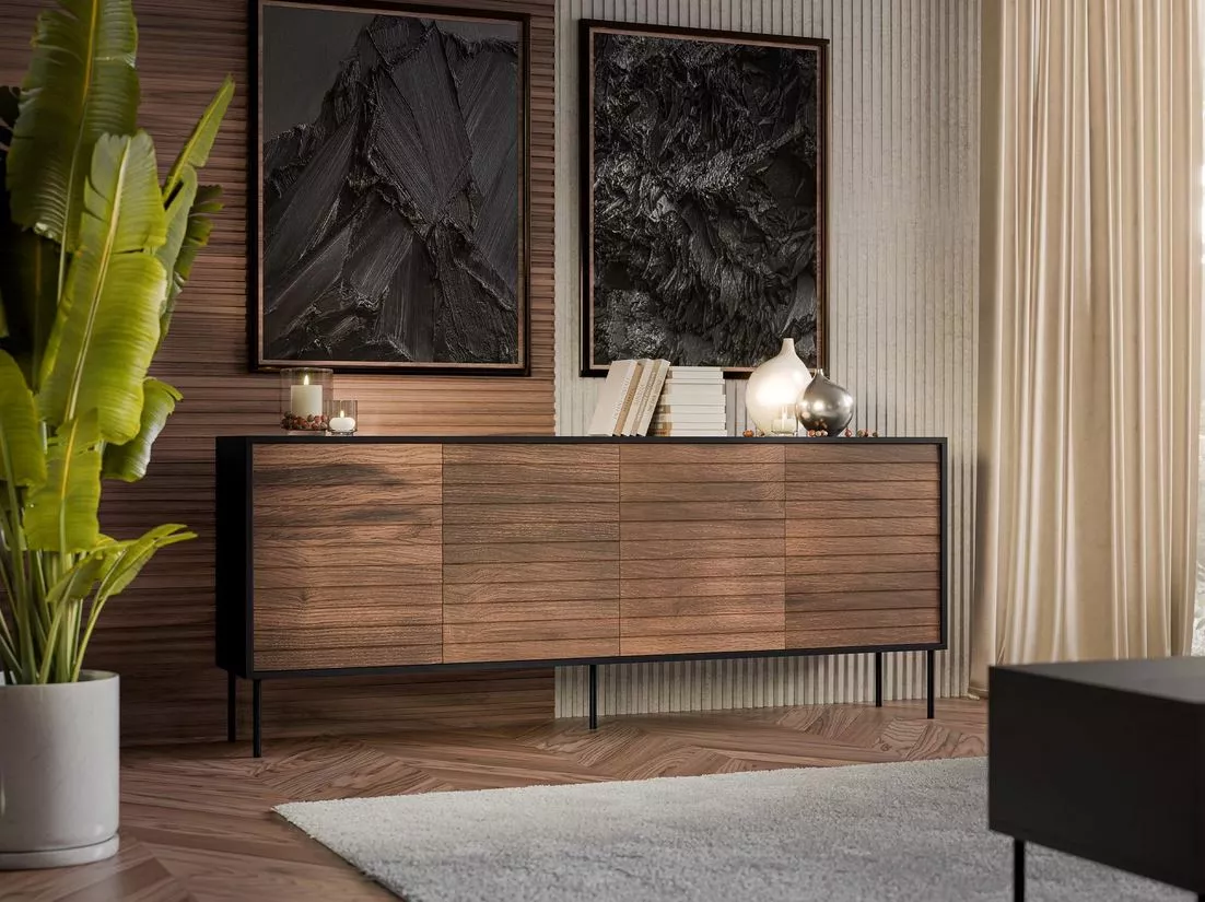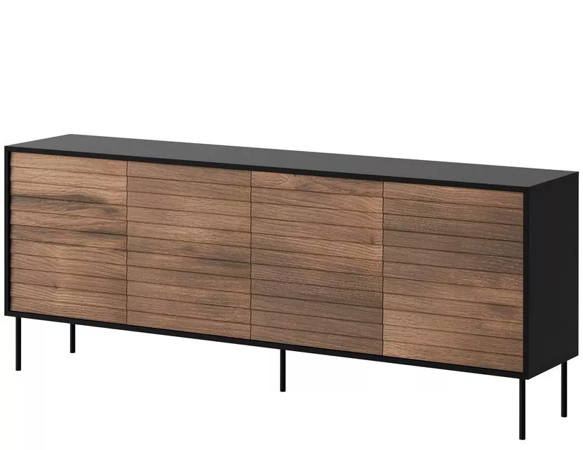 Získejte elegantní a funkční úložné řešení díky široké komodě s dvířky MAYKI. Komoda je vybavena řadou prostorných polic. Vysoké nožky umožňují snadnější udržování pořádku pod komodou.