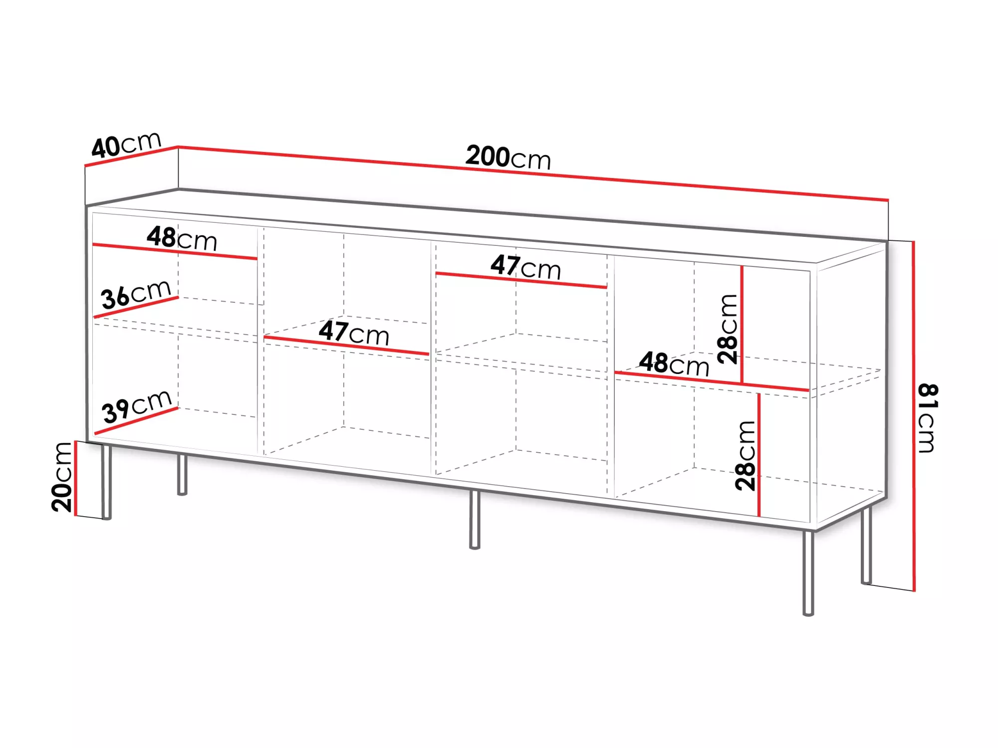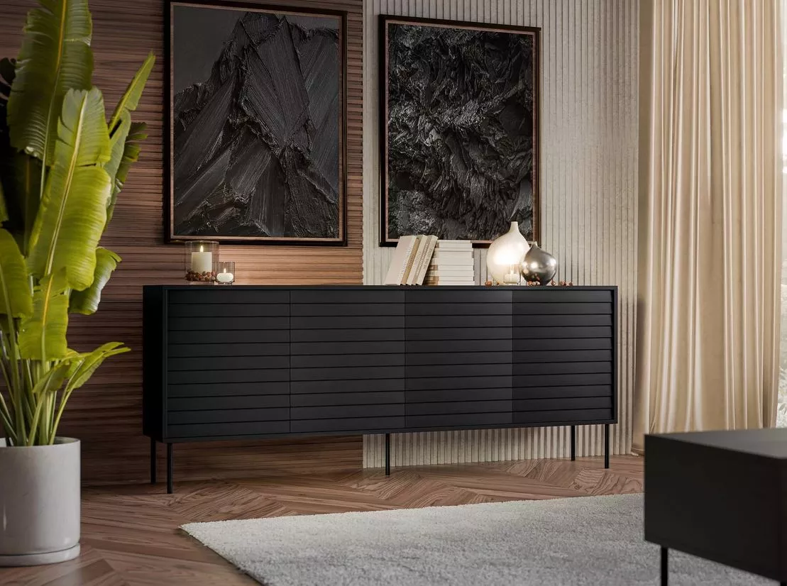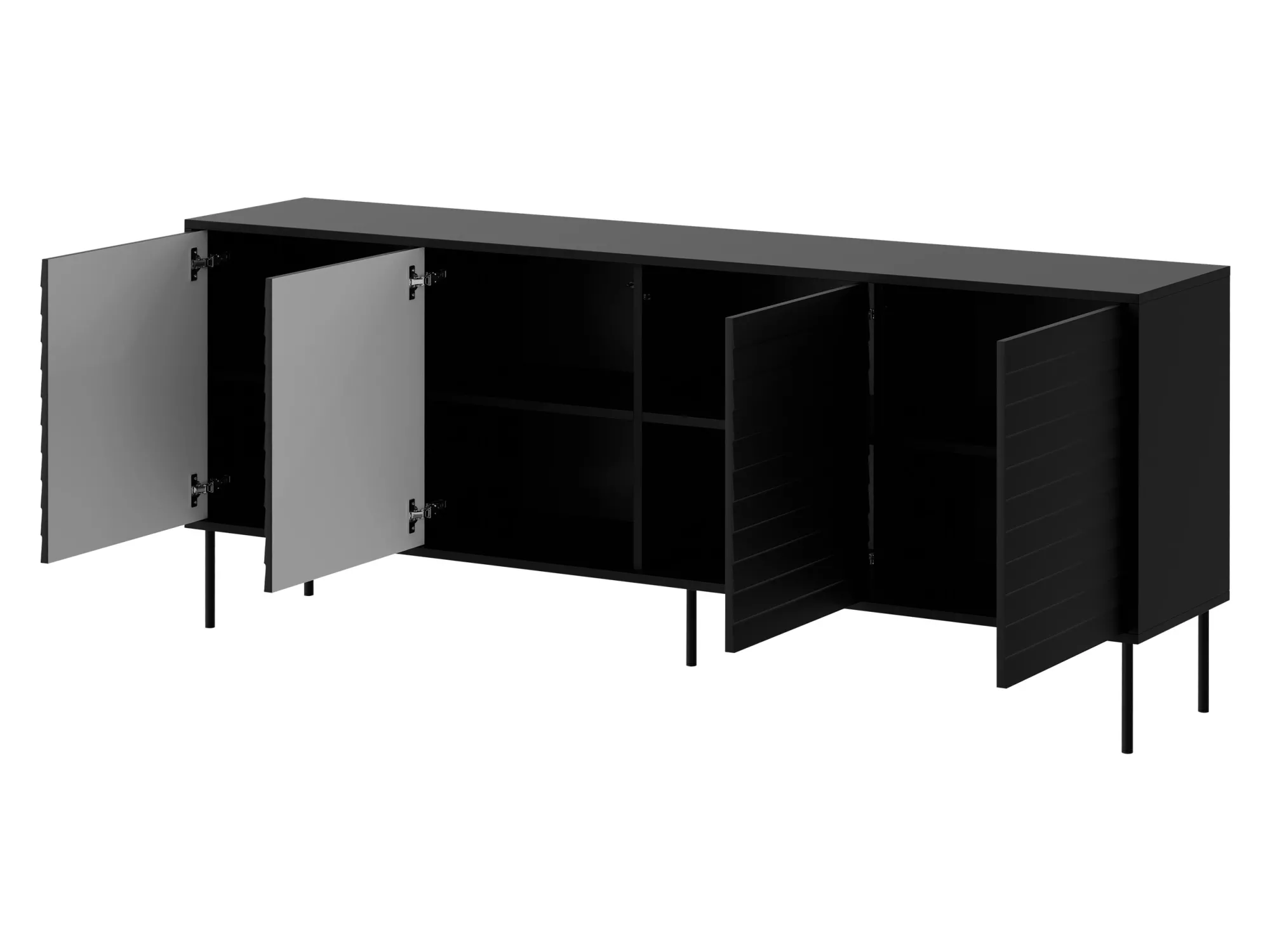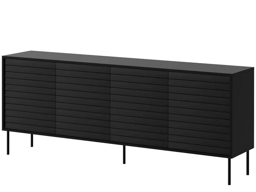 Získejte elegantní a funkční úložné řešení díky široké komodě s dvířky MAYKI. Komoda je vybavena řadou prostorných polic. Vysoké nožky umožňují snadnější udržování pořádku pod komodou.