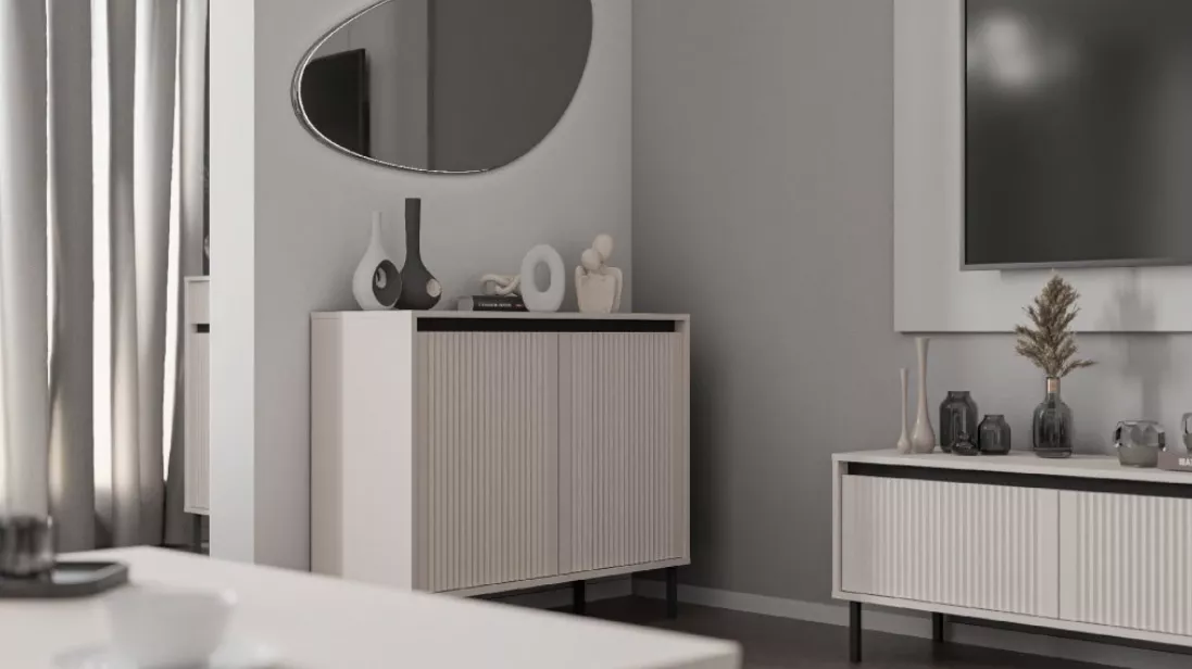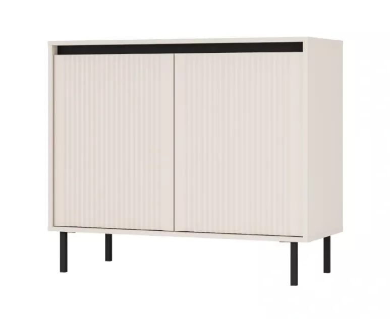 Dvoudveřová komoda TIRIL zaujme 3D dvířky. Součástí komody jsou 2 poličky.
