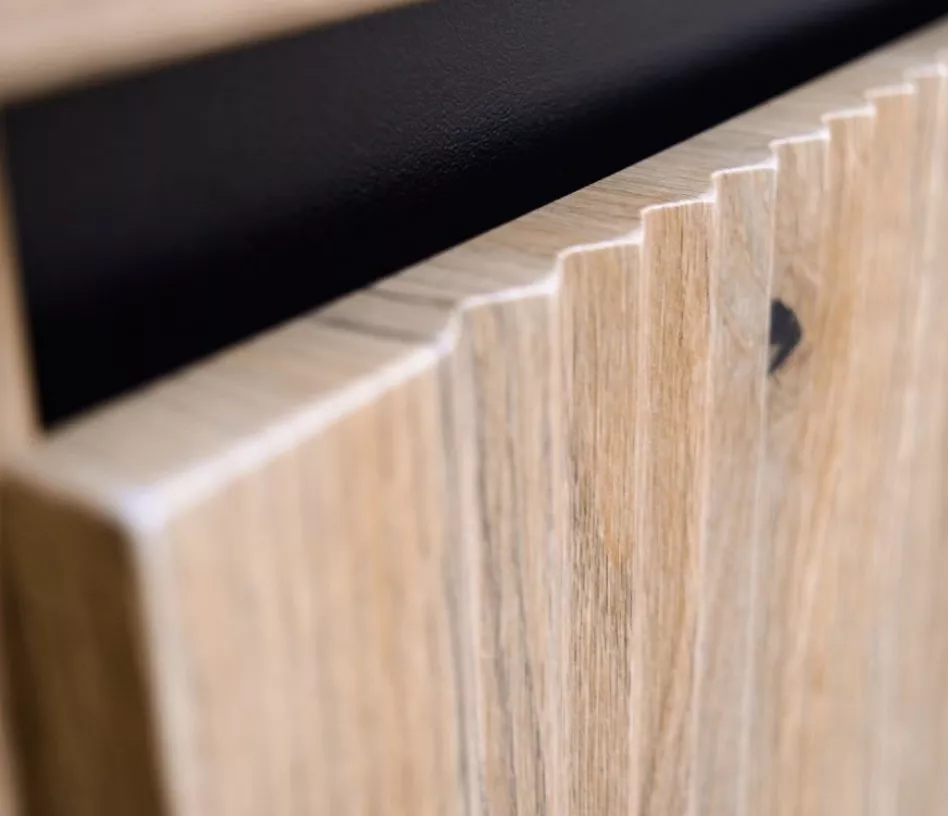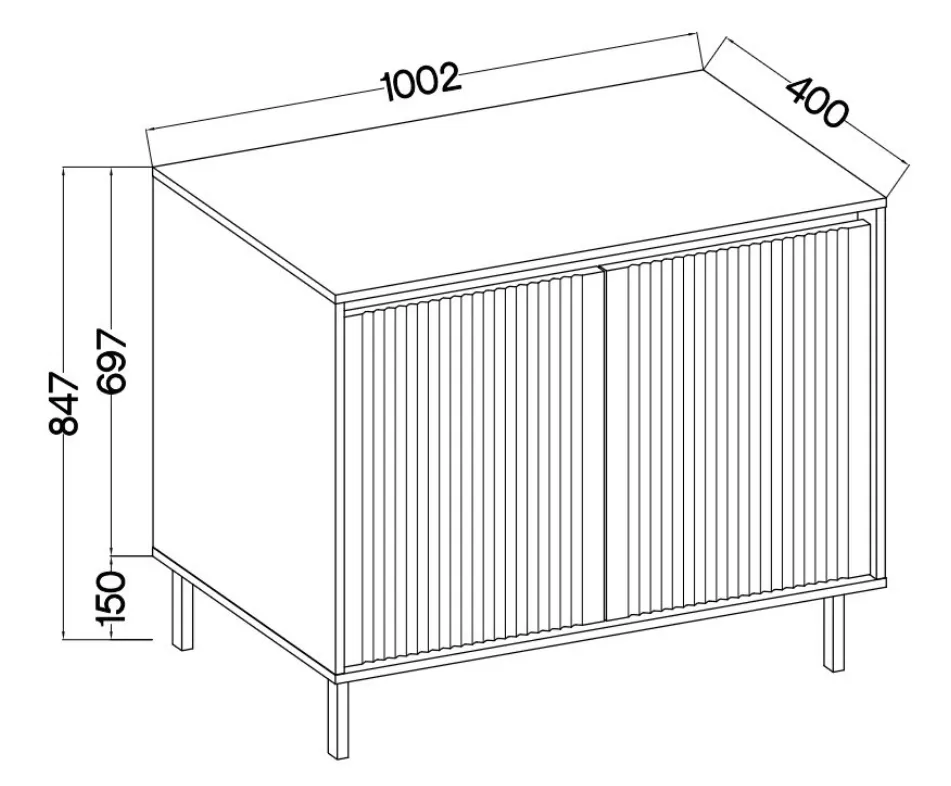 Dvoudveřová komoda TIRIL zaujme 3D dvířky. Součástí komody jsou 2 poličky.