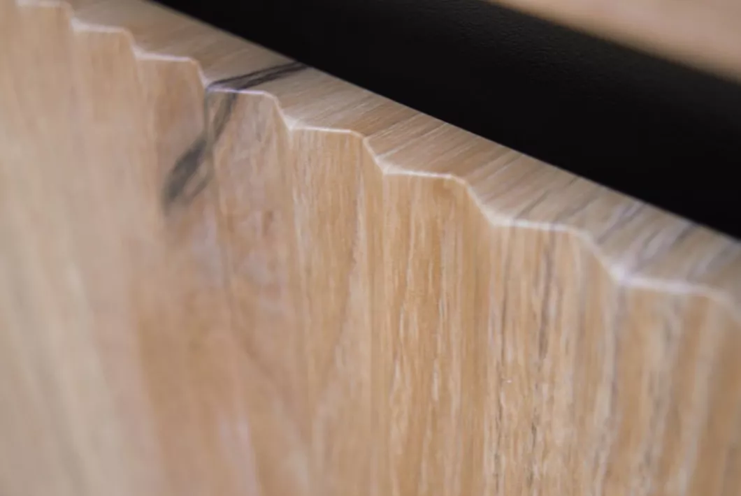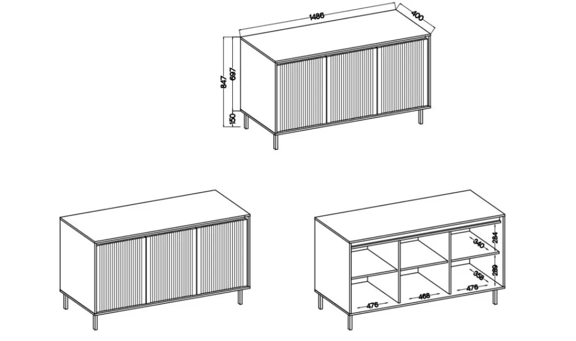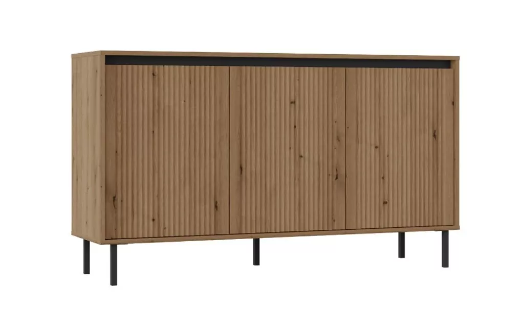 Třídveřová komoda TIRIL zaujme 3D dvířky. Součástí komody jsou 3 poličky.