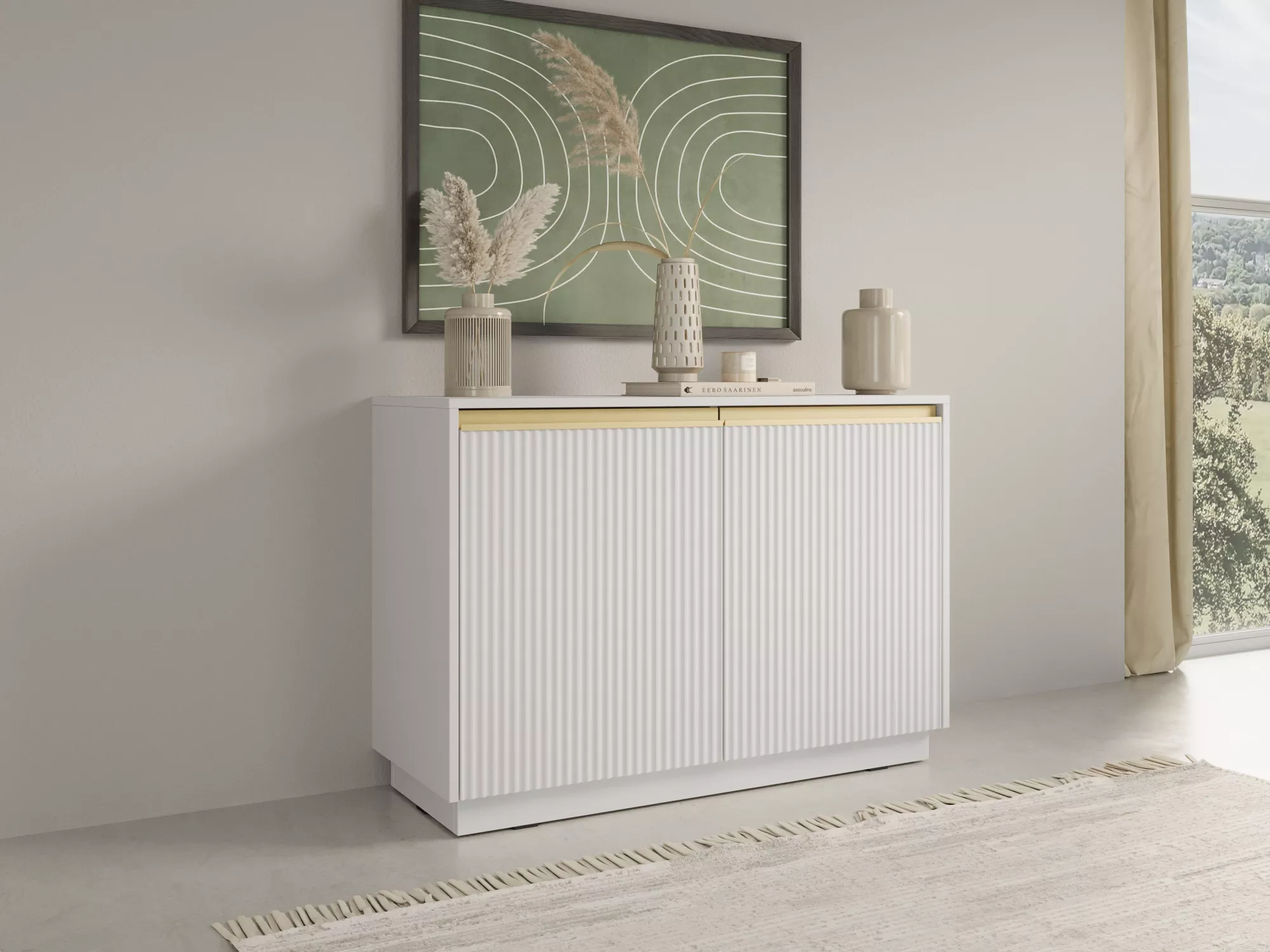 Komoda s policemi MANANA se vyznačuje jedinečným designem díky ozdobnému frézování. Hodí se do všech moderních obývacích pokojů, ložnice či předsíně. Disponuje 2 prostornými uzavřenými policemi.